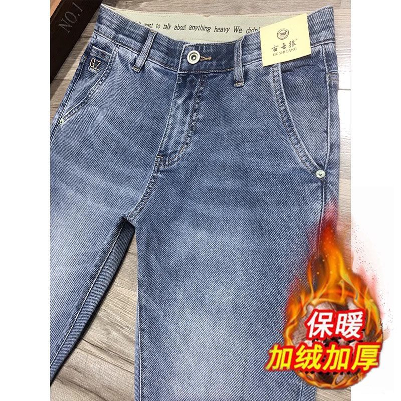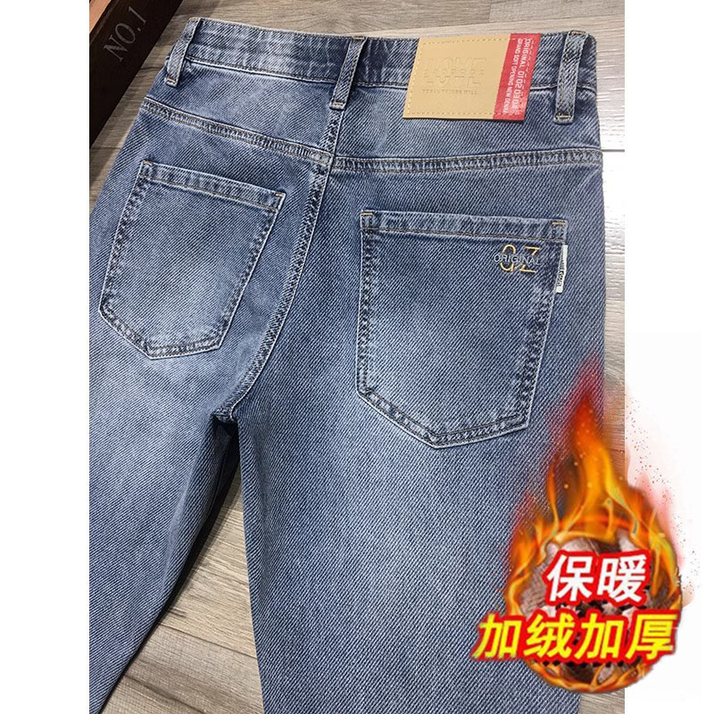 冬季牛仔裤男九分裤高端潮牌蓝色斜纹面料弹力修身小脚长裤加绒款