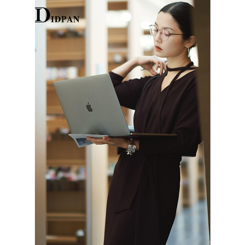 IDPAN气质v领连衣裙2025秋季新款绑脖飘带设计围裹式针织通勤长裙