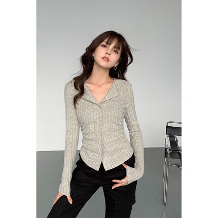 NEVA HUV 秋日狂想 小翻领坑条针织衫女v领修身气质收腰长袖上衣