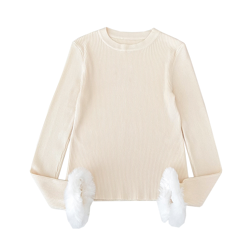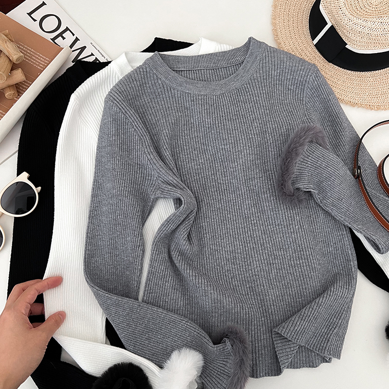 设计感时尚百搭毛毛袖口圆领修身显瘦短款长袖针织衫毛衣打底衫女