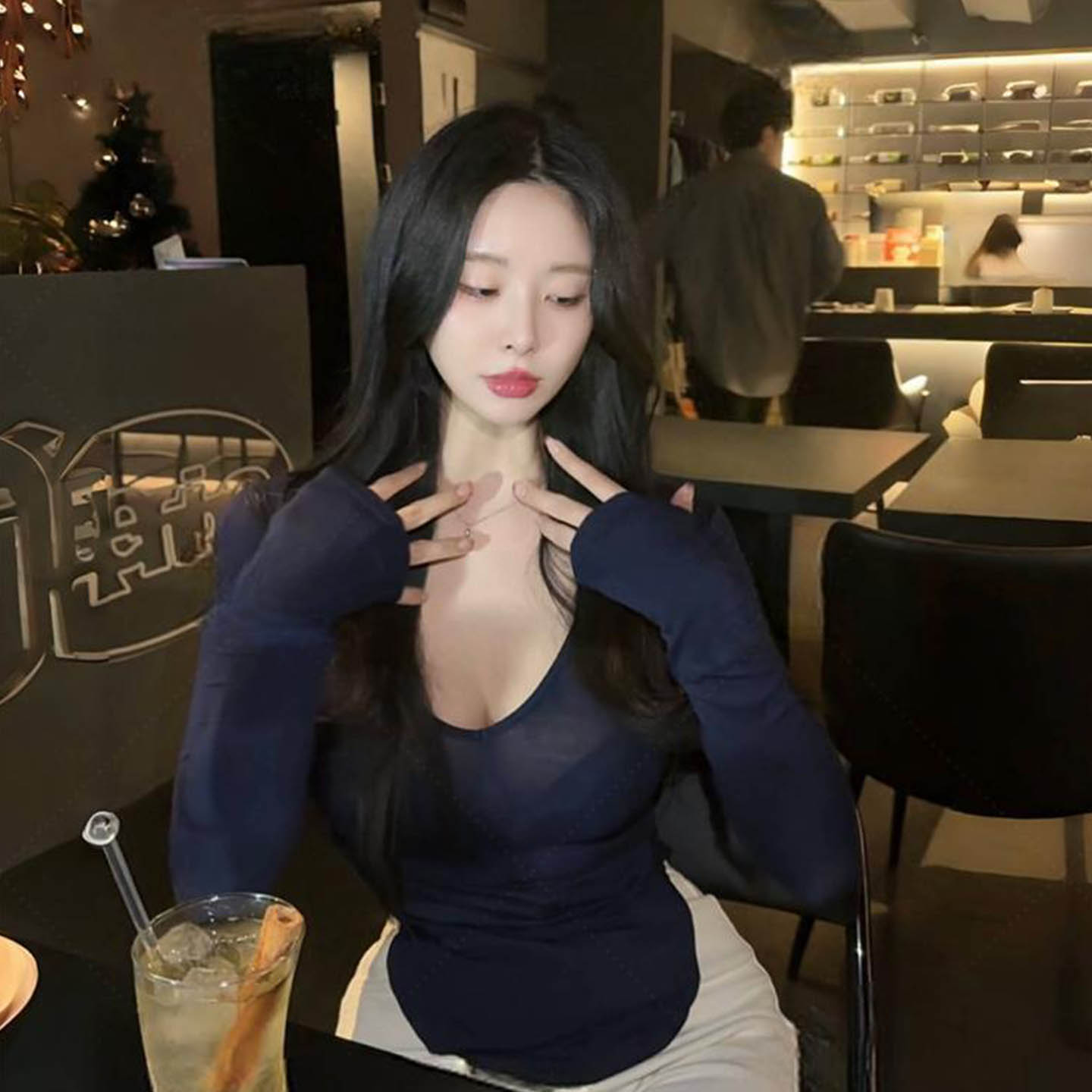 夜场纯欲辣妹性感紧身U领显胸大长袖t恤短款内搭打底衫上衣女秋季