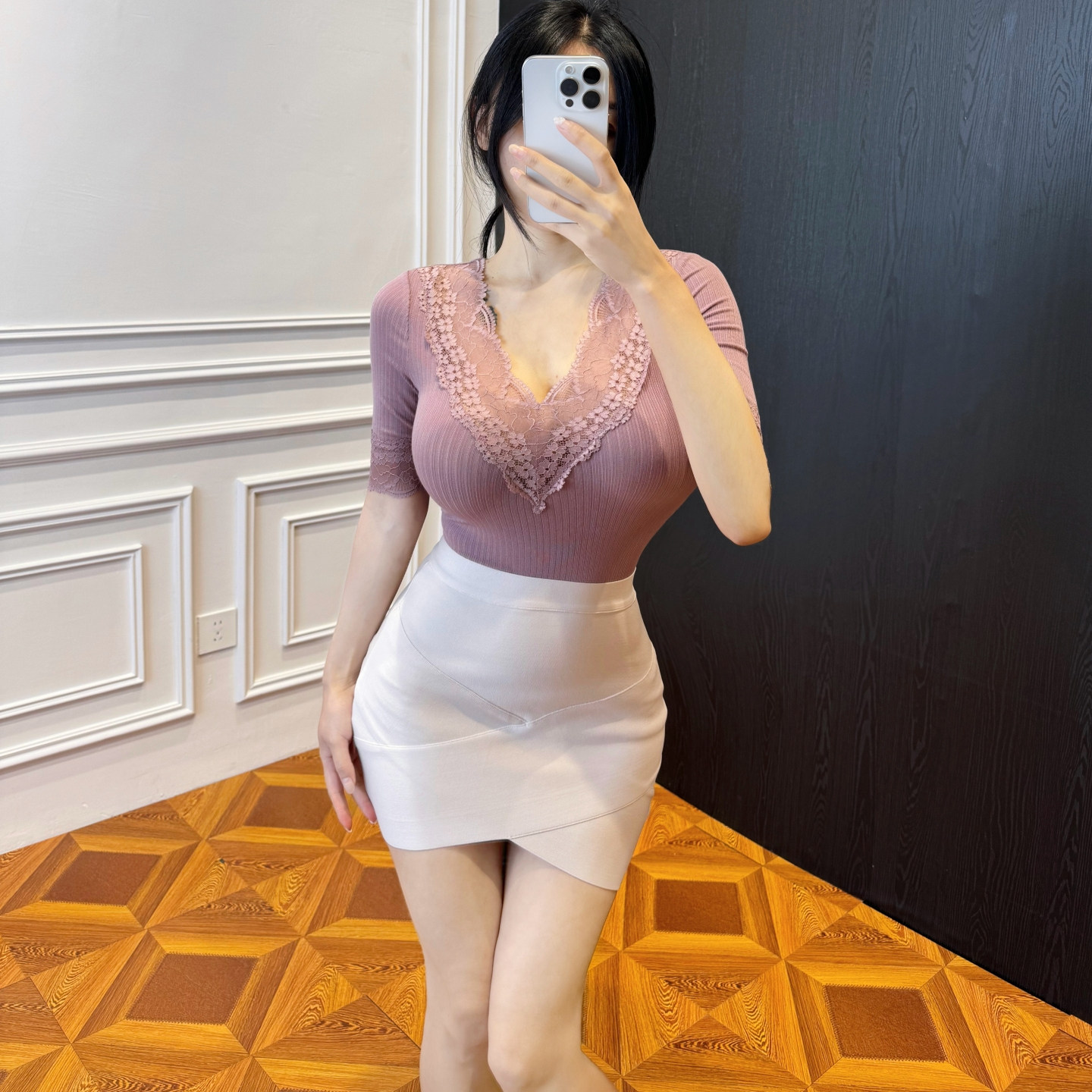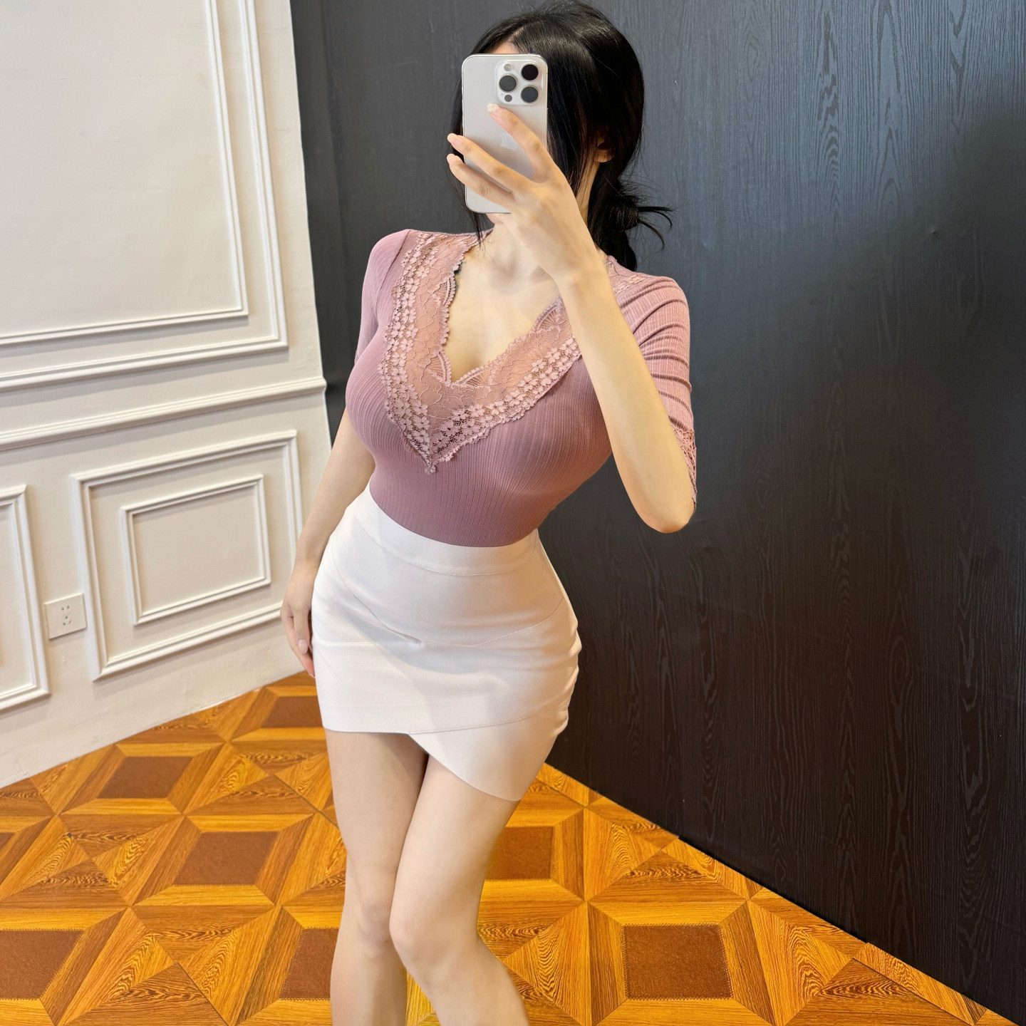 思瑞 醉花绣语v领蕾丝上衣 原创中袖弹力精致拼接领口刺绣罗纹T恤