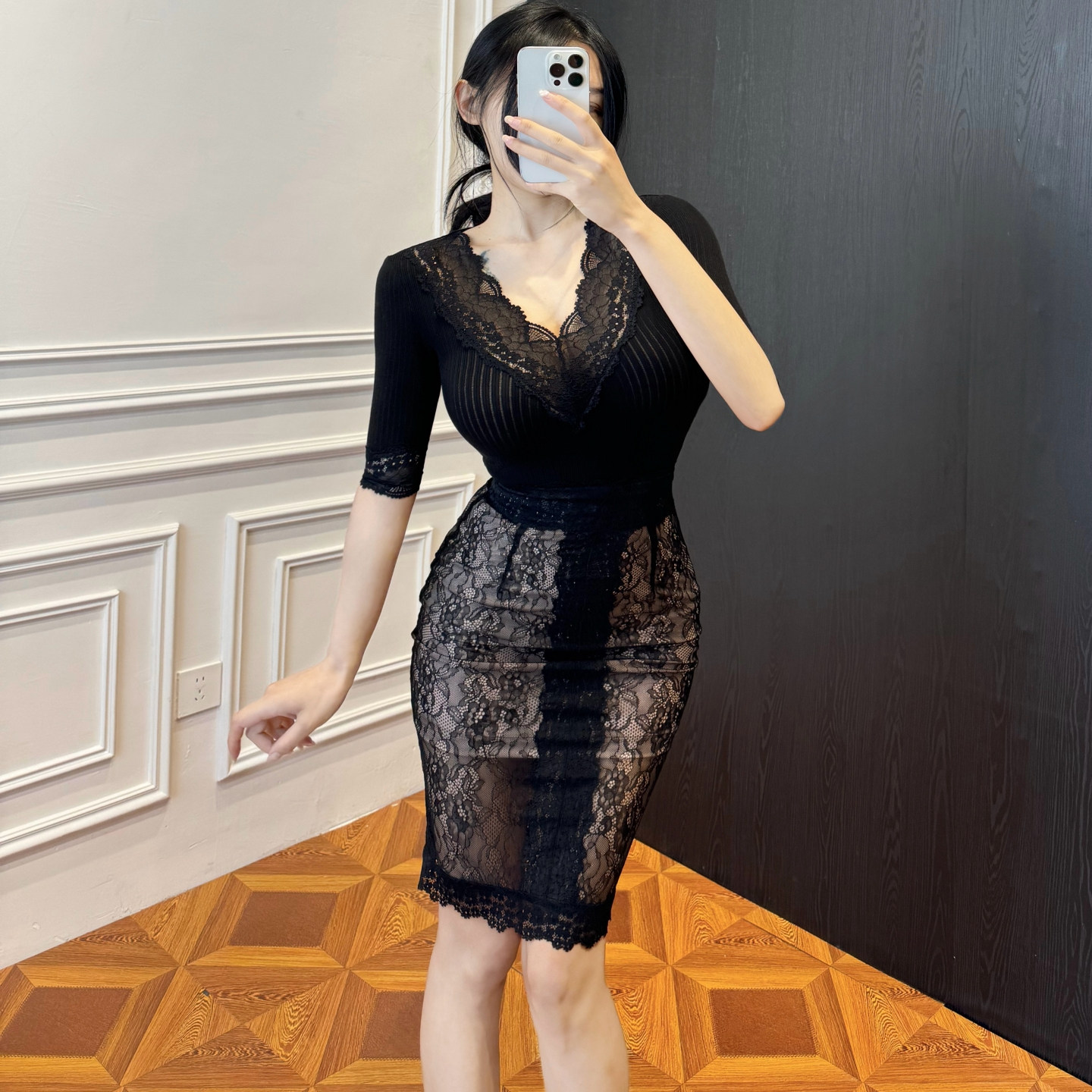 中袖精致拼接蕾丝刺绣罗纹上衣女