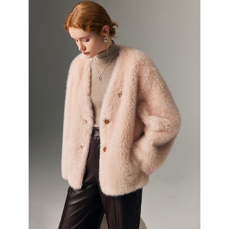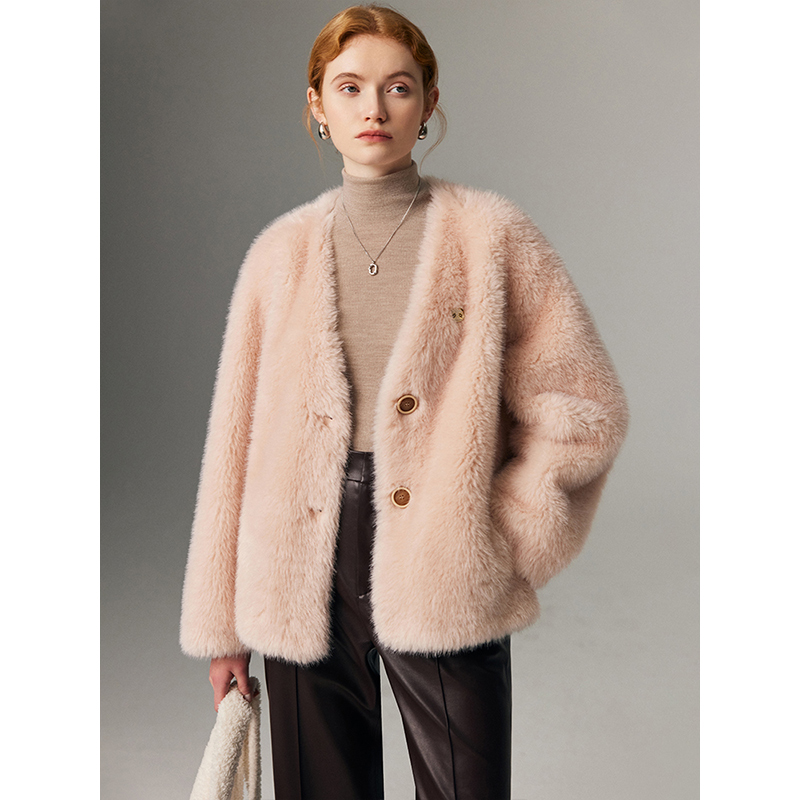 皮毛一体外套女2025年冬季新款V领粉色减龄休闲气质毛毛皮草上衣