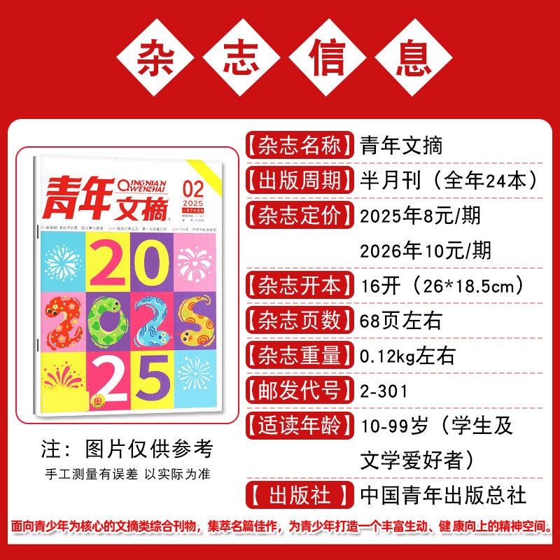 青年文摘杂志2026年1-5期现货全年/半年订阅官方旗舰店彩版合订本初高中学生意林读者中考高考作文素材过刊2025/2024年1-24期清仓