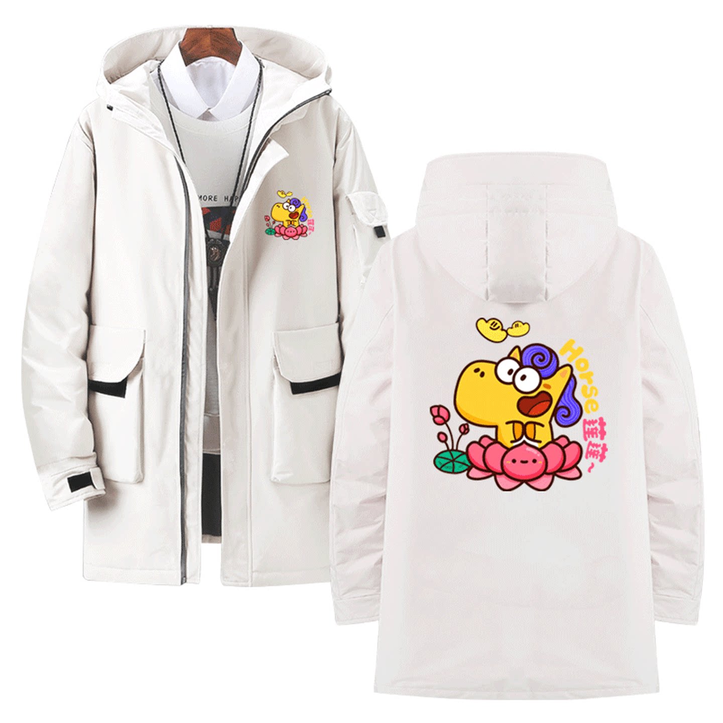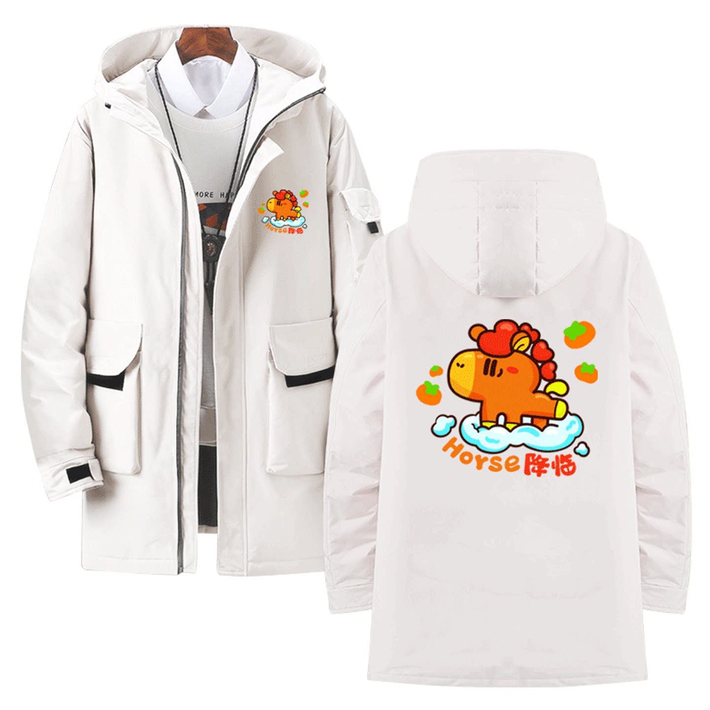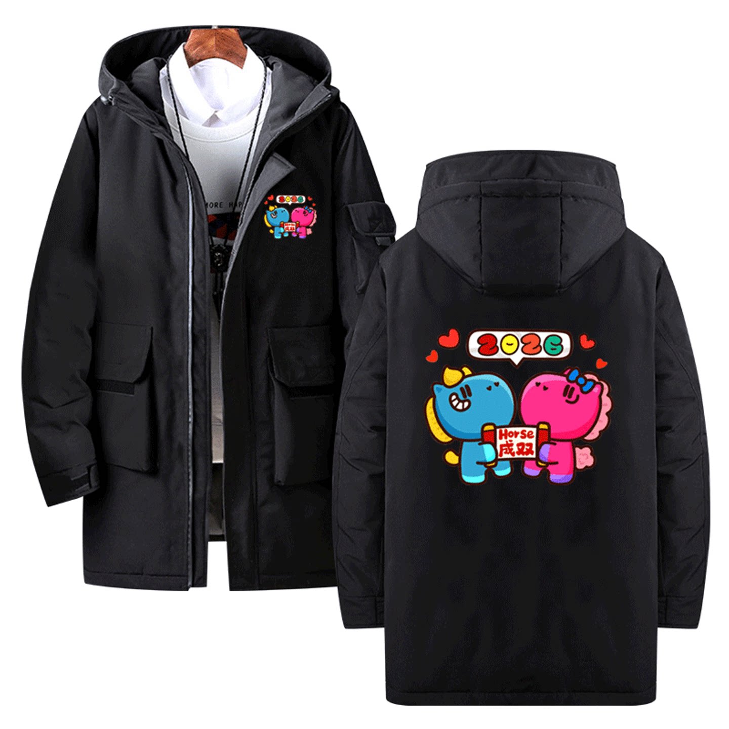 新年2026马年创意搞笑谐音梗趣味印花男女秋冬可定制中长款羽绒服