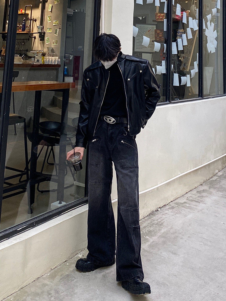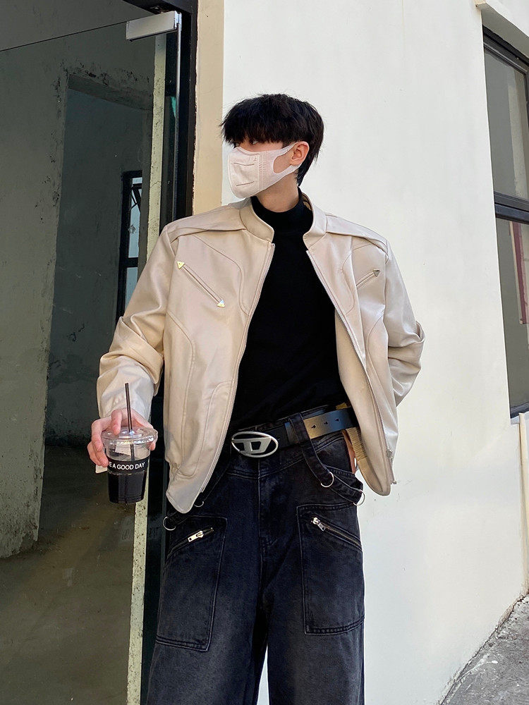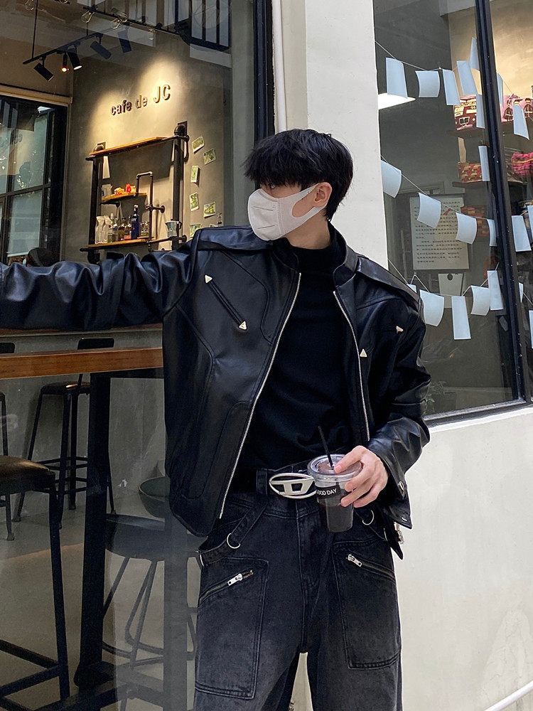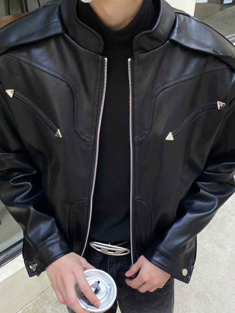 高级感短款机车皮衣男女小众金属设计感黑色休闲翻领垫肩夹克外套
