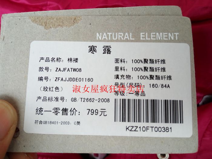 专柜正品自然元素 薄款棉衣短款长袖棉服修身外套玫红色棉褛ATW07
