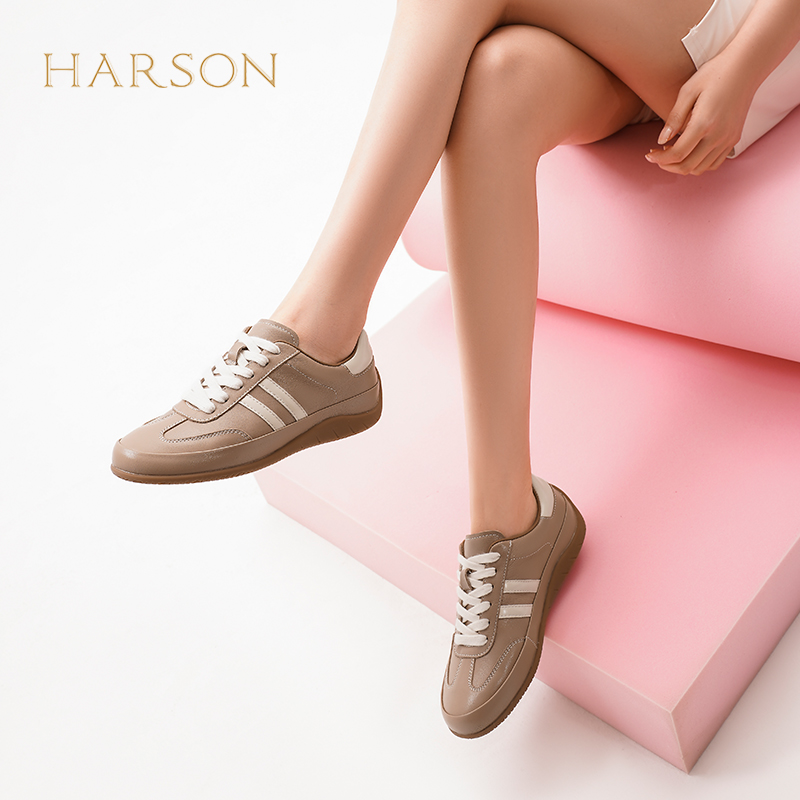 哈森真皮透气德训鞋女2025春季新款平底系带休闲运动鞋HCS250601