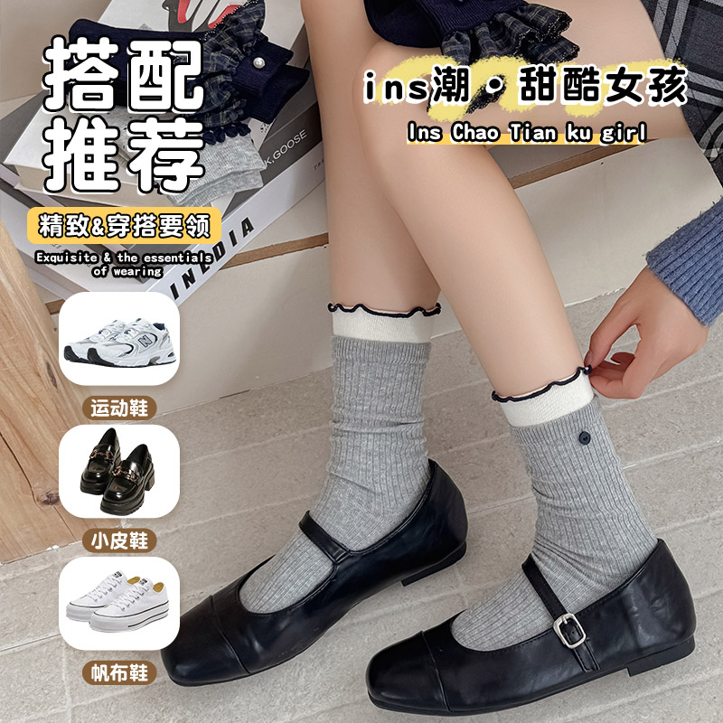 双针饰品蕾丝蝴蝶结花边堆堆袜日系洛丽塔韩版中筒袜子女秋冬防臭