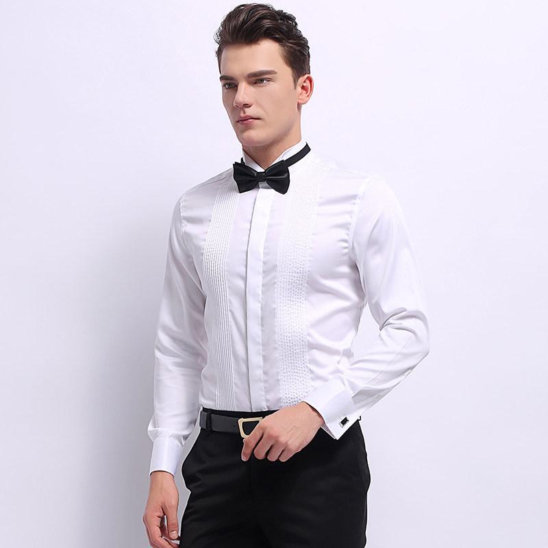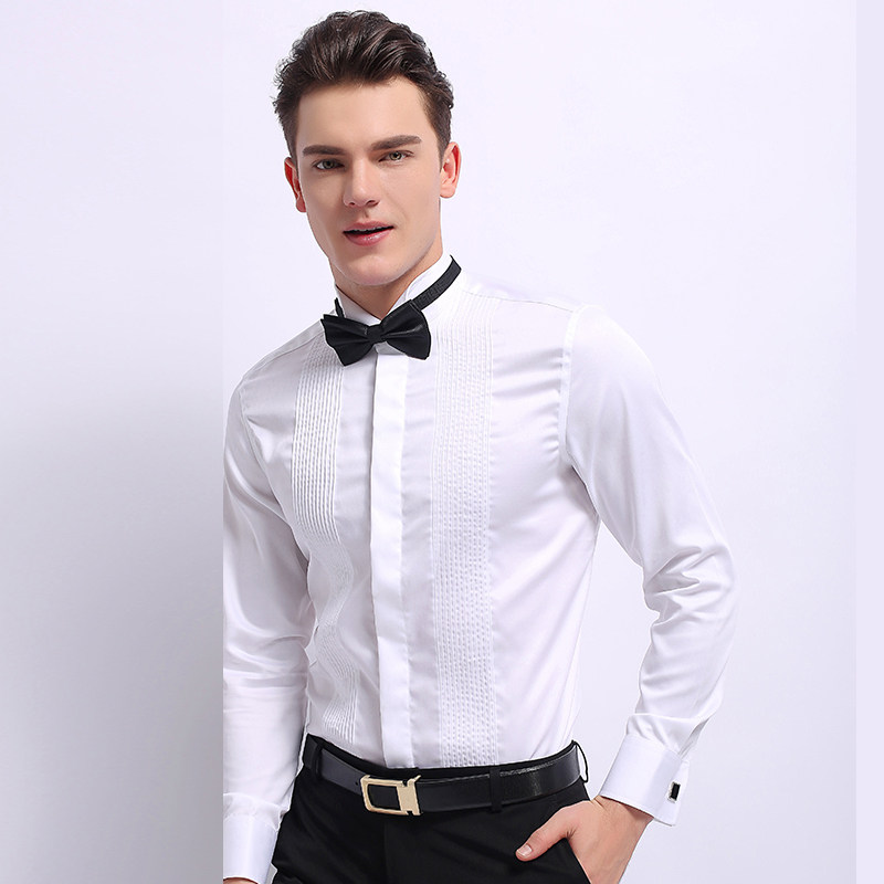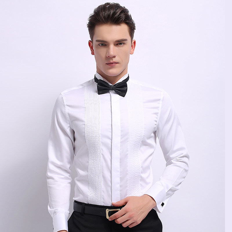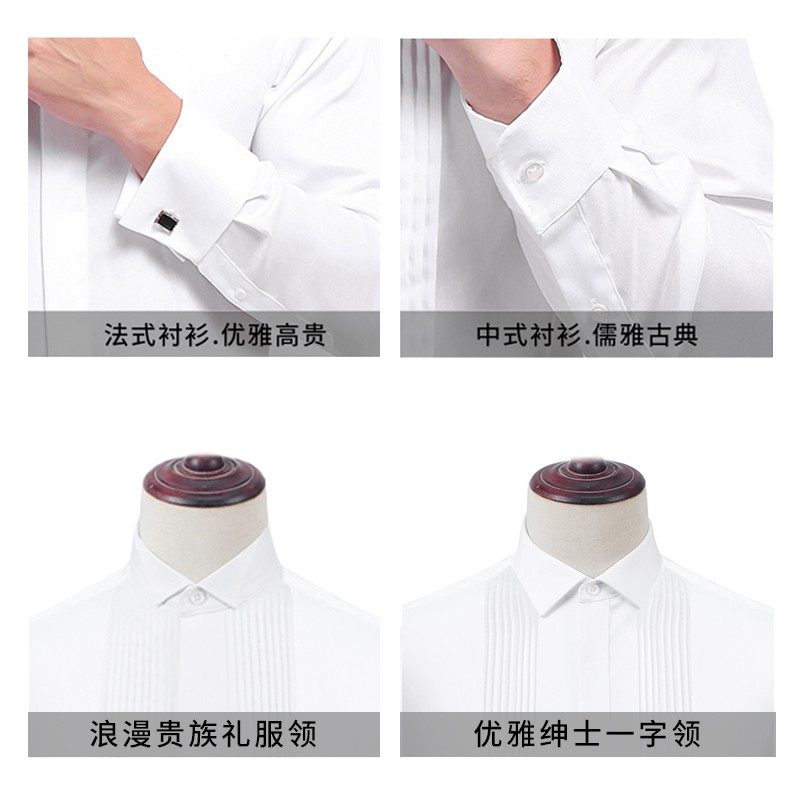 夏季薄款礼服衬衫男长袖白色燕子翼领法式结婚男士领结新郎白衬衣