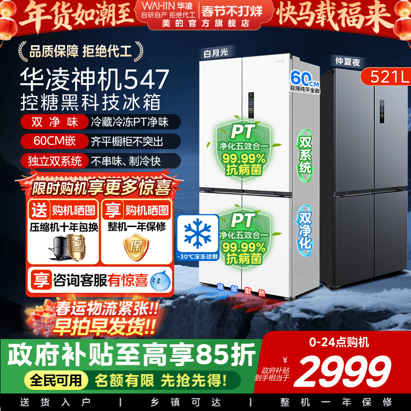 美的出品华凌神机547十字双开四门双系统超薄大容量零嵌冰箱一级