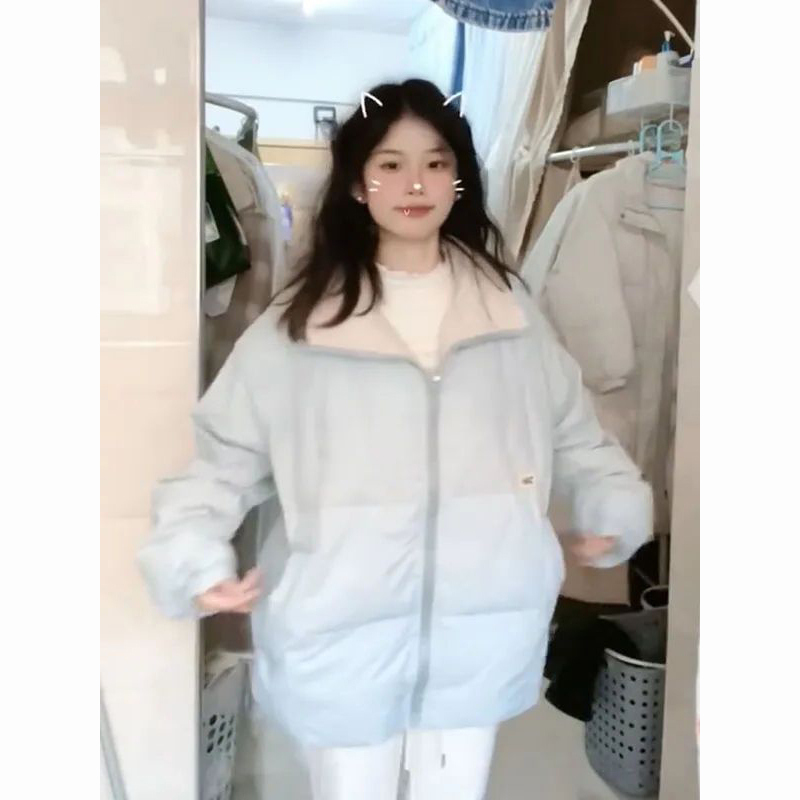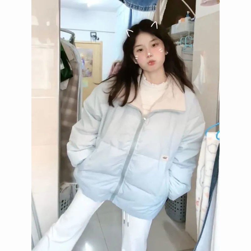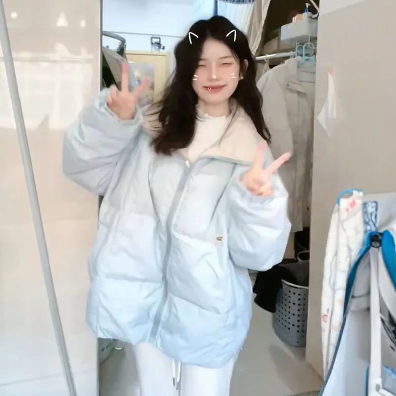 冬季浅蓝色宽松甜美学院风立领加厚保暖面包服外套女显瘦保暖棉服