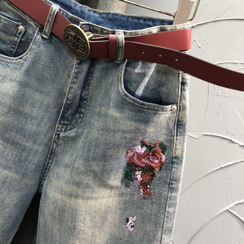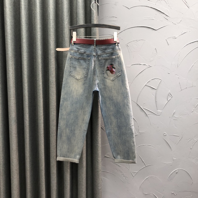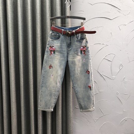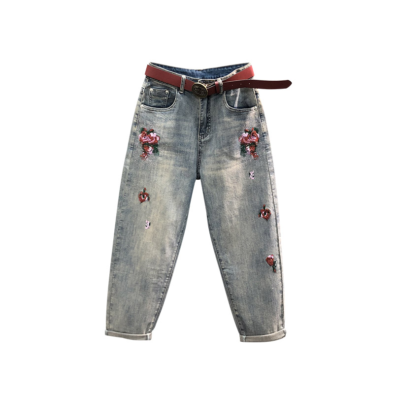 个性玫瑰刺绣哈伦牛仔裤女秋季时尚休闲洋气复古怀旧小脚萝卜垮裤