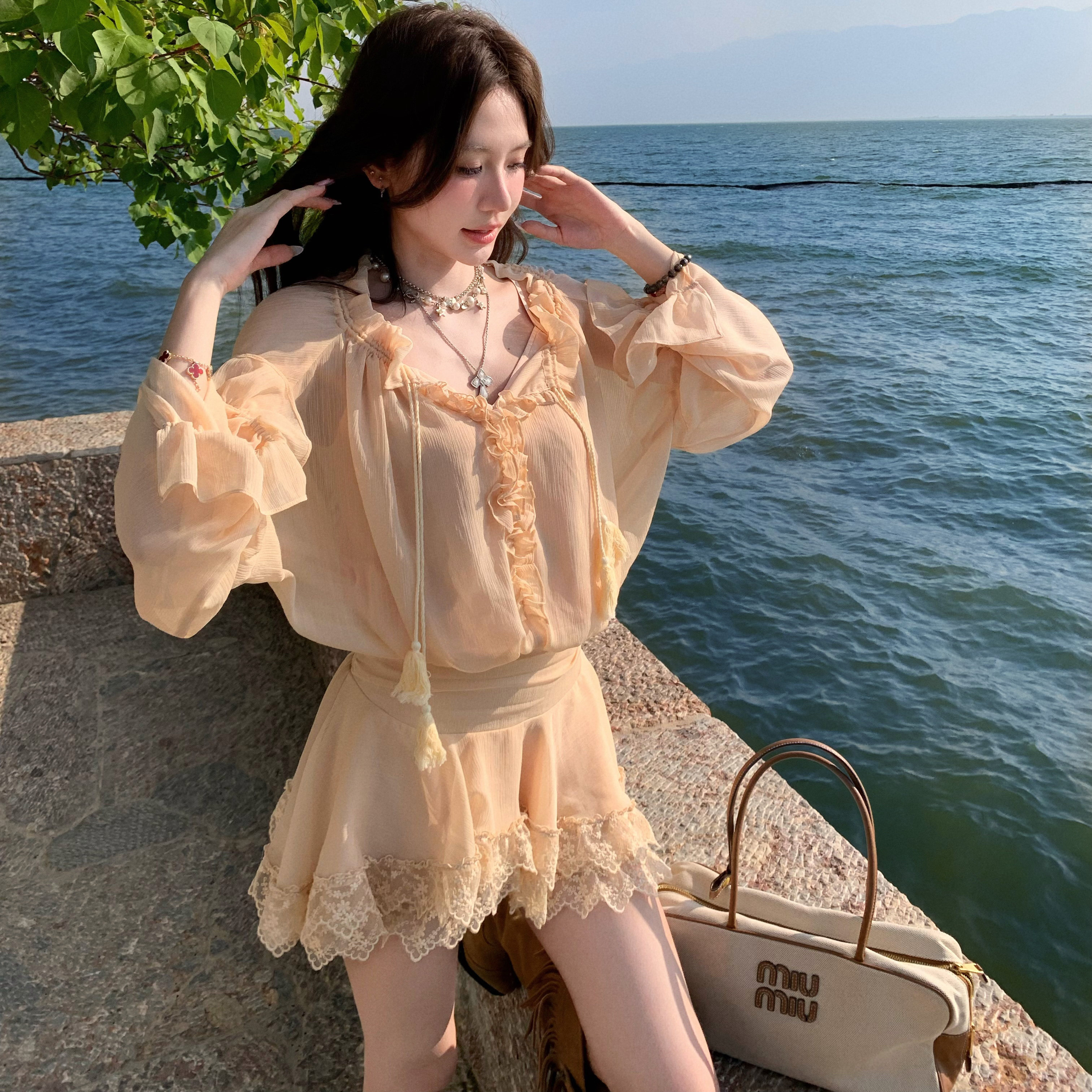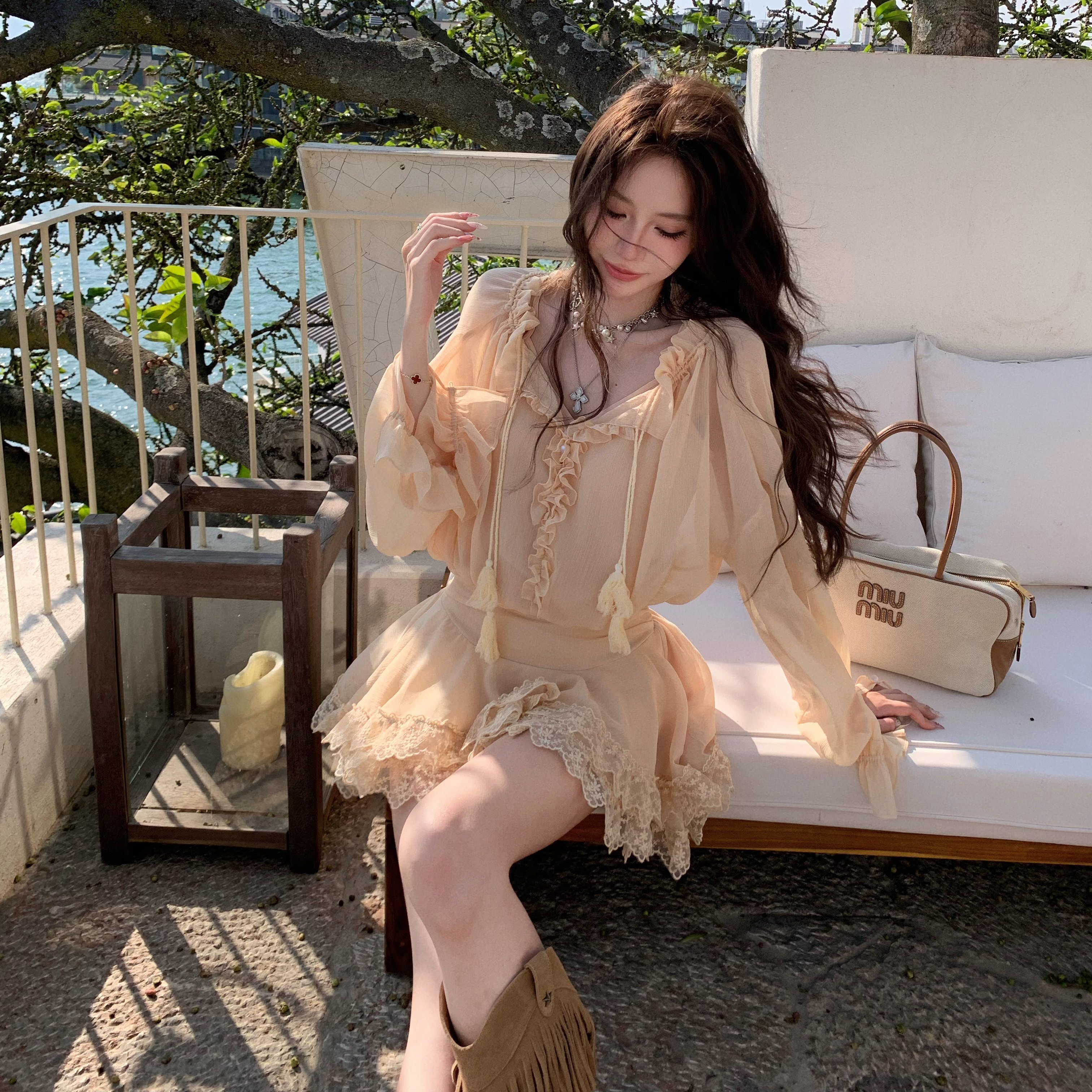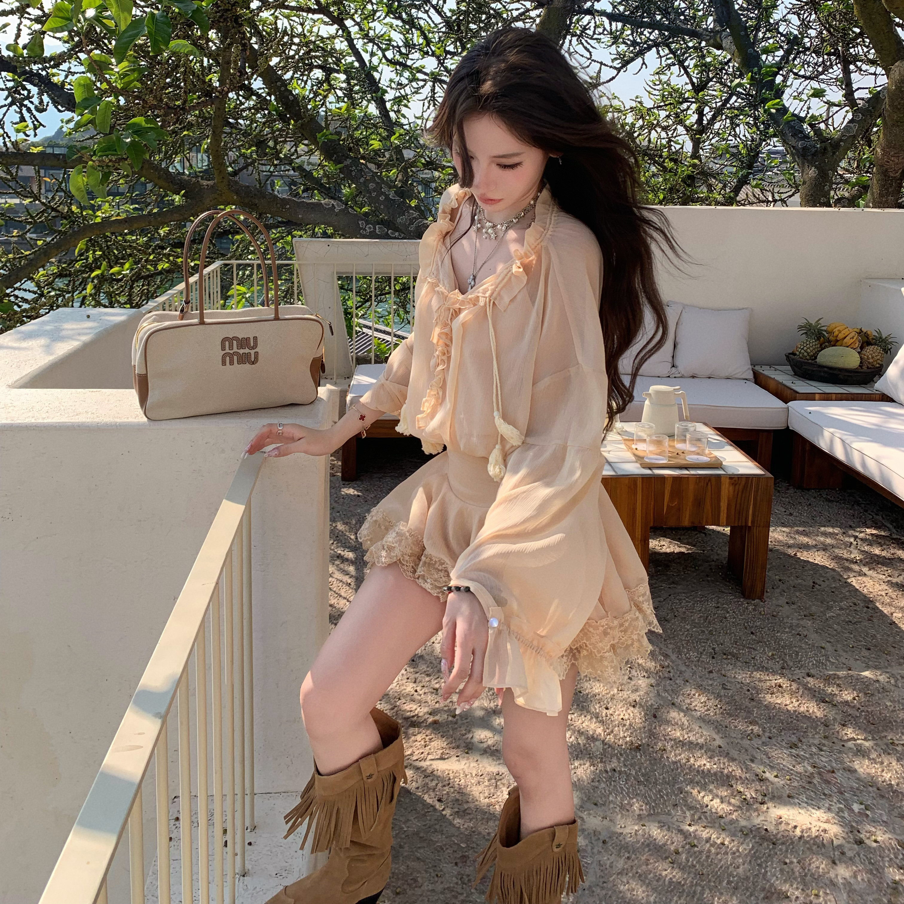八盖pinky piggy 南法假日 米黄色蕾丝连衣裙女花边收腰系带短裙