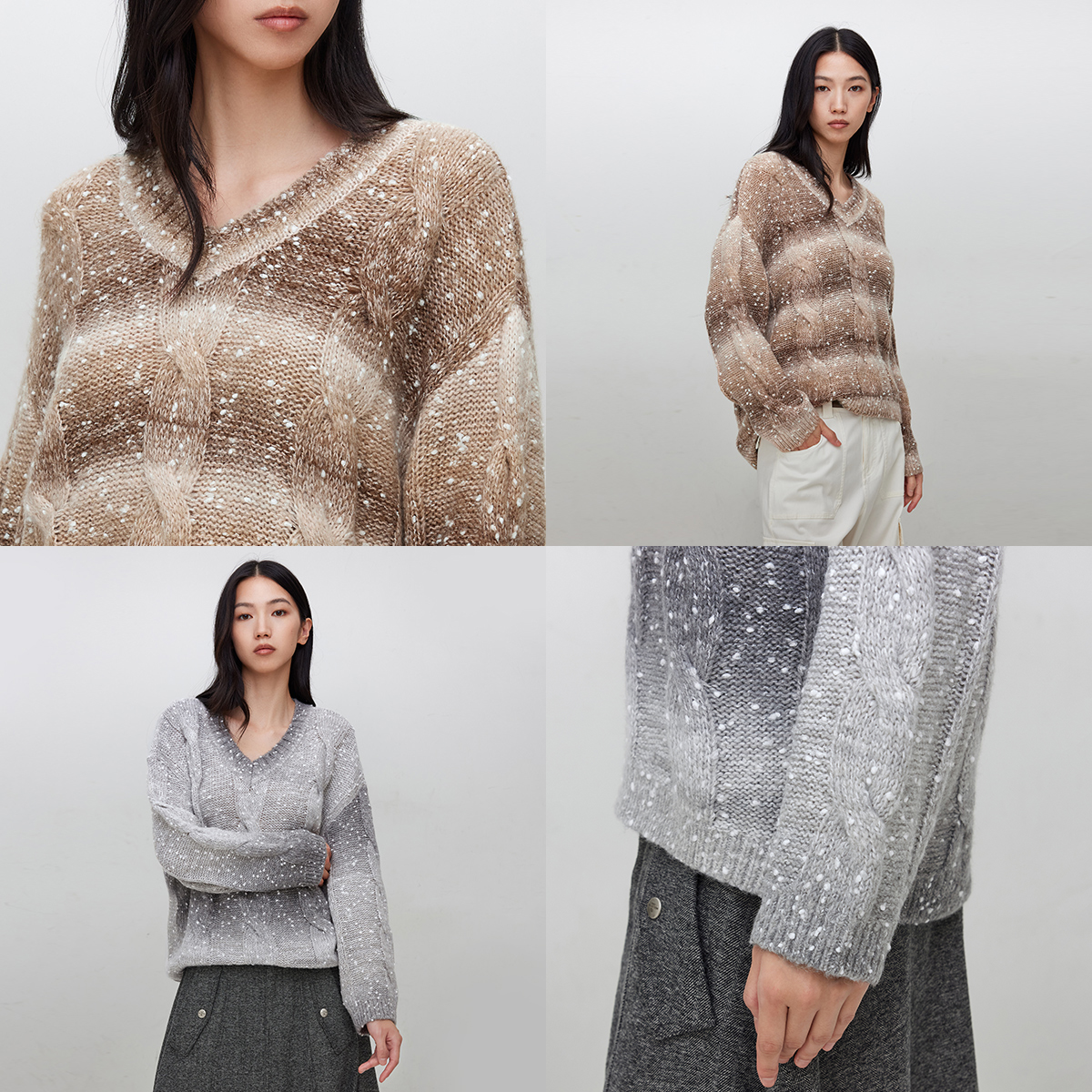ONLY2025冬季新款宽松落肩V领时髦渐变条纹含绵羊毛毛衣针织衫女