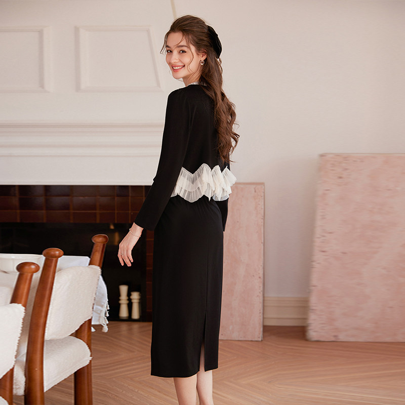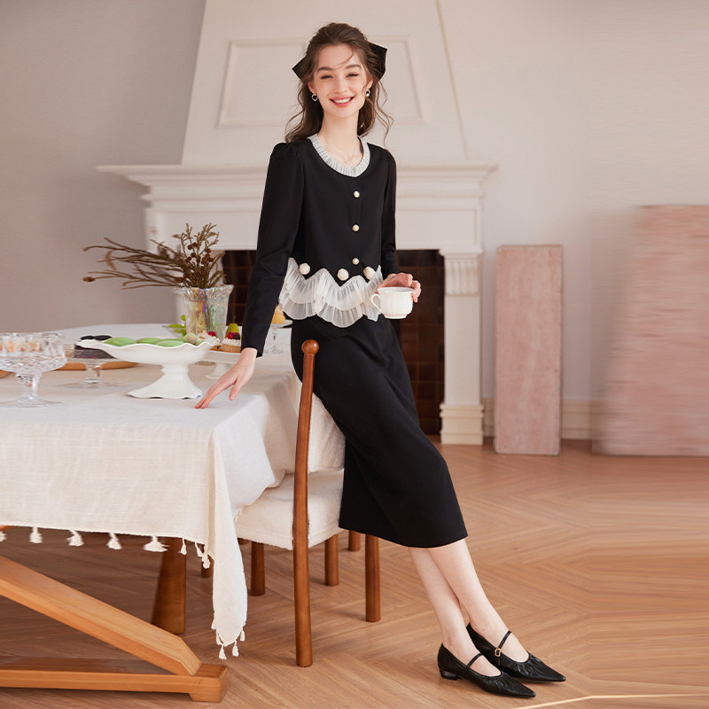白鹿语法式赫本风显瘦拼接2件套2025春新款高级感掐腰小黑裙套装
