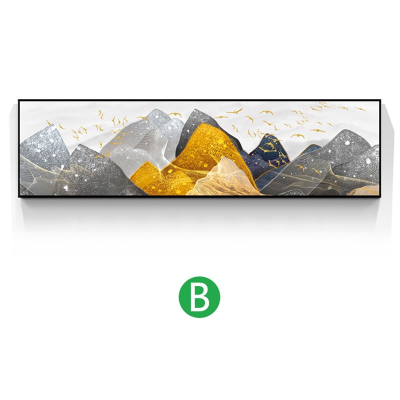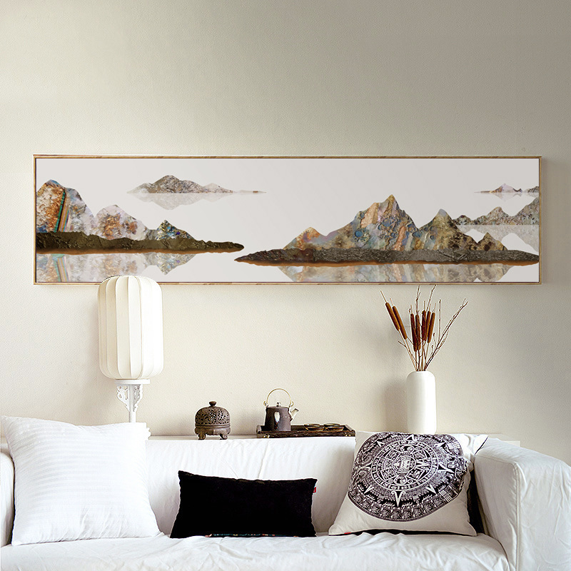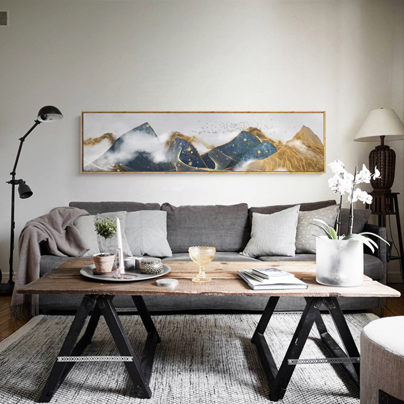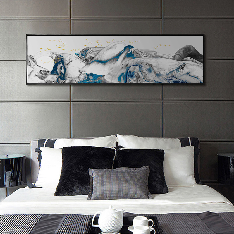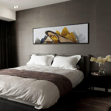 新中式卧室床头装饰画卧s云金色山水抽象画线条现代简约飞鸟挂画