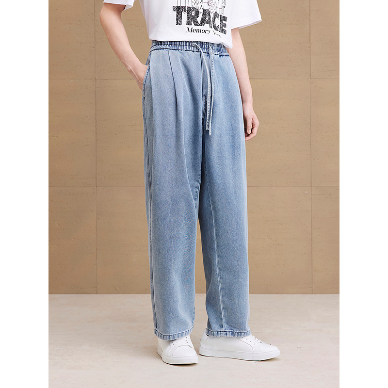 【凉感】GXG男装 宽松直筒松紧褶皱设计牛仔裤长裤子2025夏季