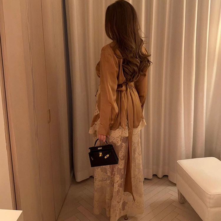 澳洲小众秋冬新款缎面真丝翻领长袖衬衫+蕾丝刺绣不规则半身裙