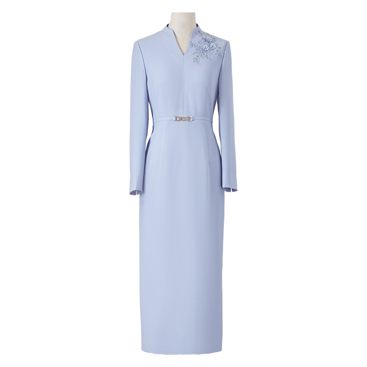 纳绎2025年秋季新款时尚优雅气质端庄大气浅蓝色直筒修身连衣裙女