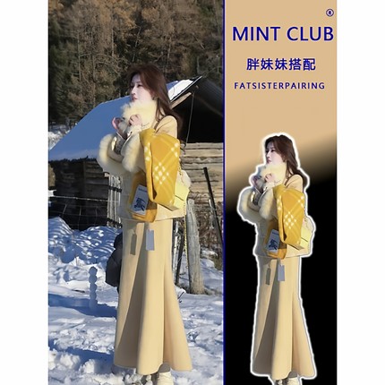 大码胖MM新中式国风刺绣盘扣保暖外套秋冬高腰鱼尾半身裙绝美套装