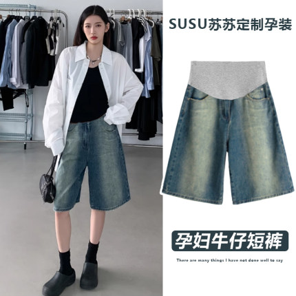孕妇复古蓝牛仔短裤夏季薄款宽松休闲百搭五分裤托腹外穿打底裤子