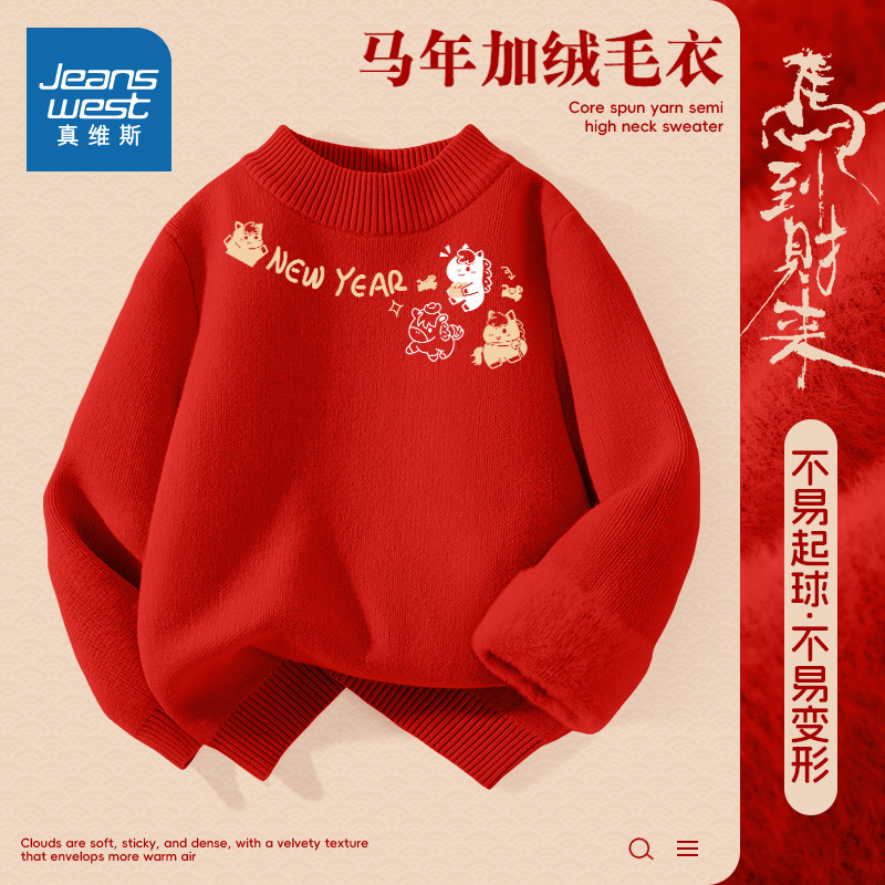 真维斯童装女童本命年衣服冬季儿童加绒红色毛衣男童马年喜庆上衣