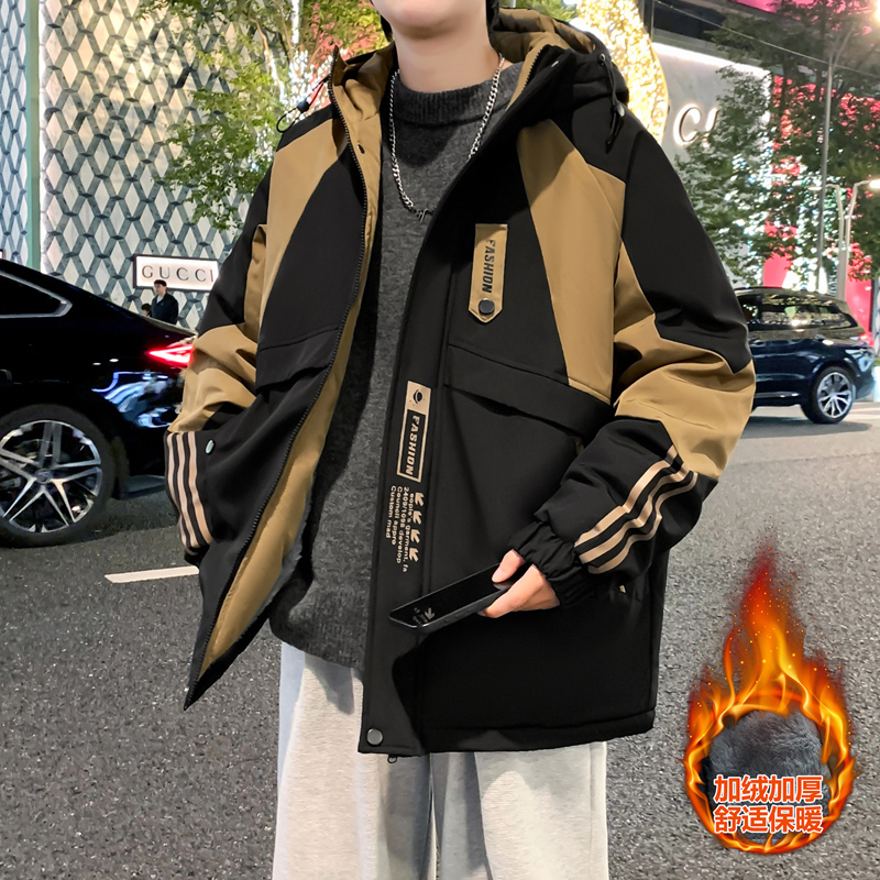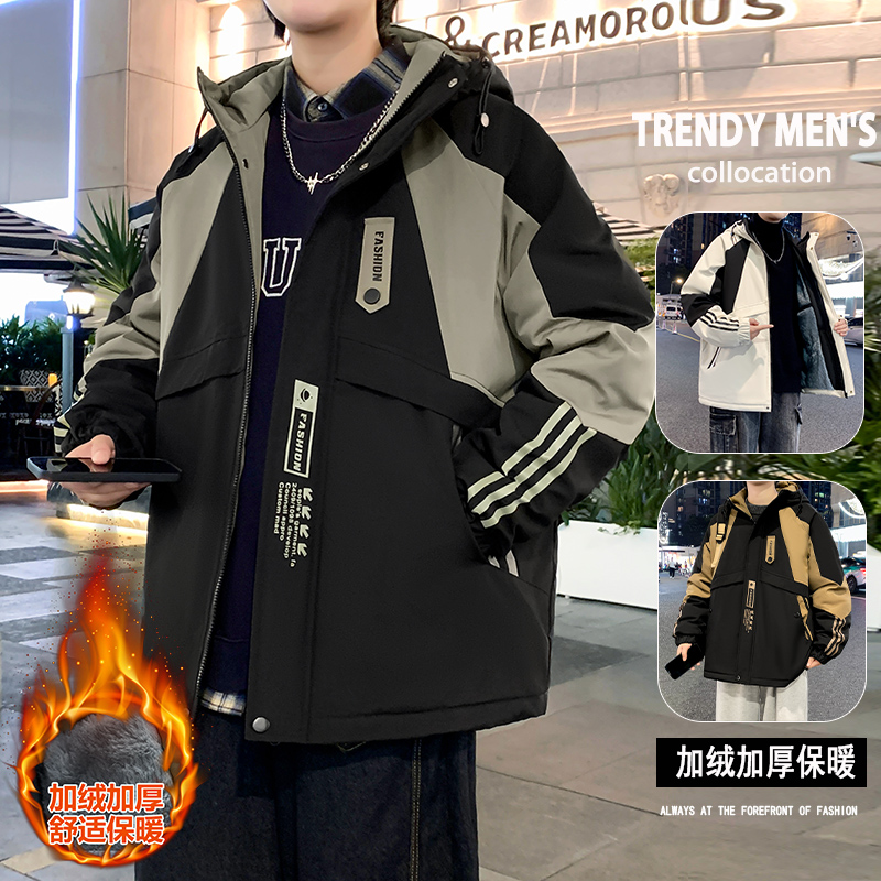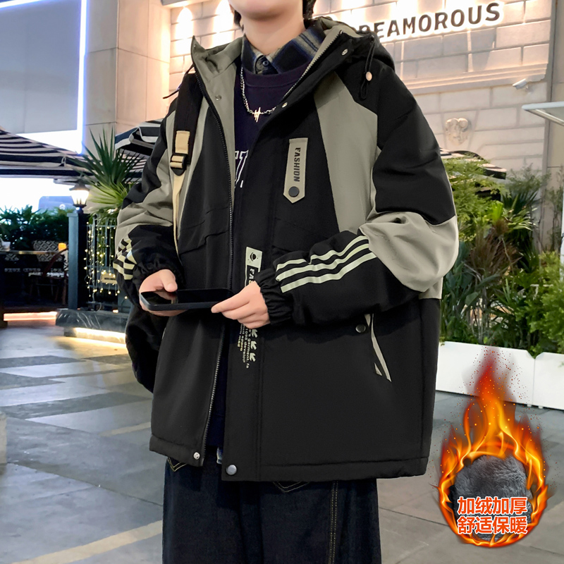 加绒工装外套冬季2025潮牌拼接连帽夹克青少年保暖棉衣服男款以純