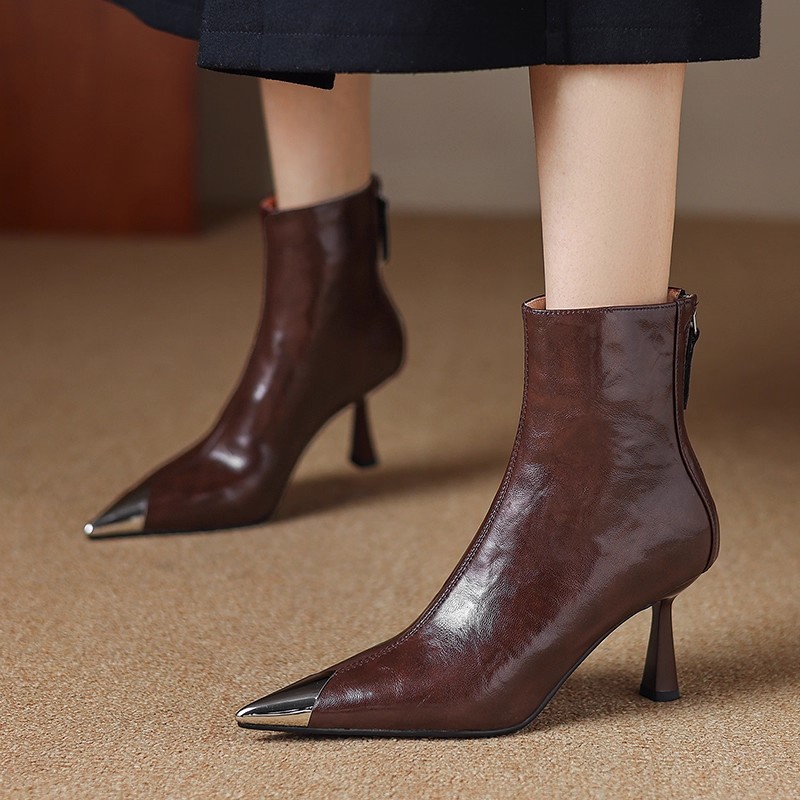 棕色尖头高跟靴金属头洋气小短靴高跟短靴不累脚真皮配裙子的靴子