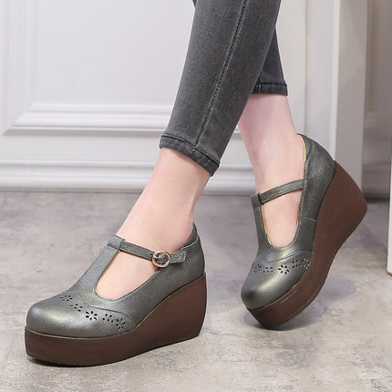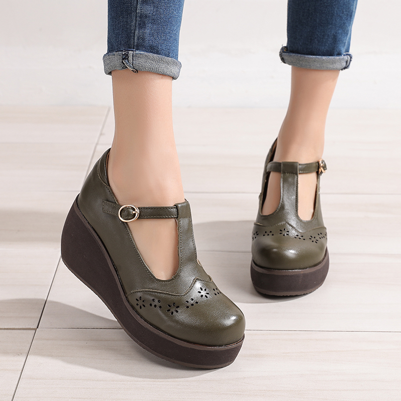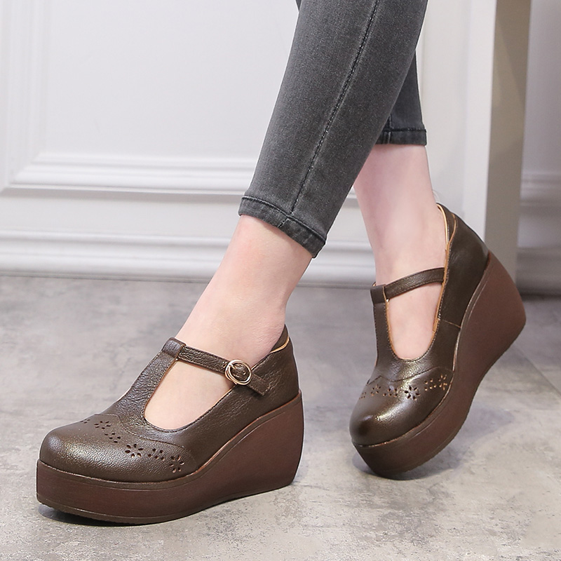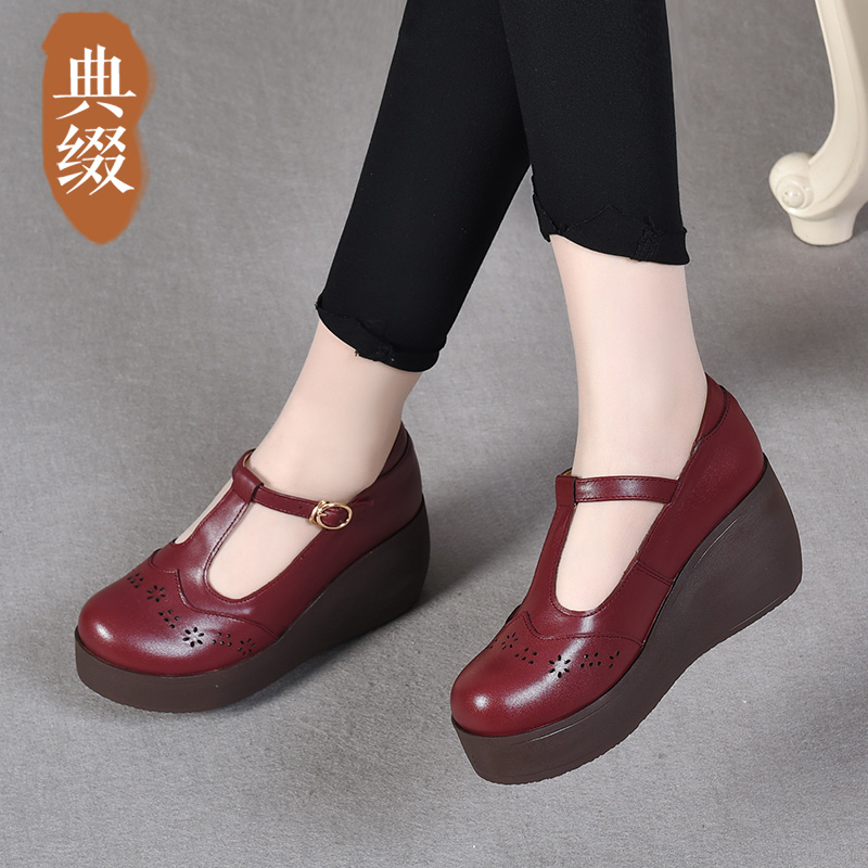 2025复古女鞋羊皮新款松糕底春秋镂空单鞋女坡跟休闲女皮鞋厚底