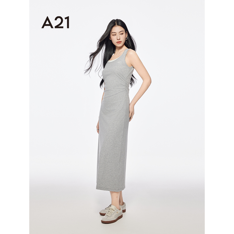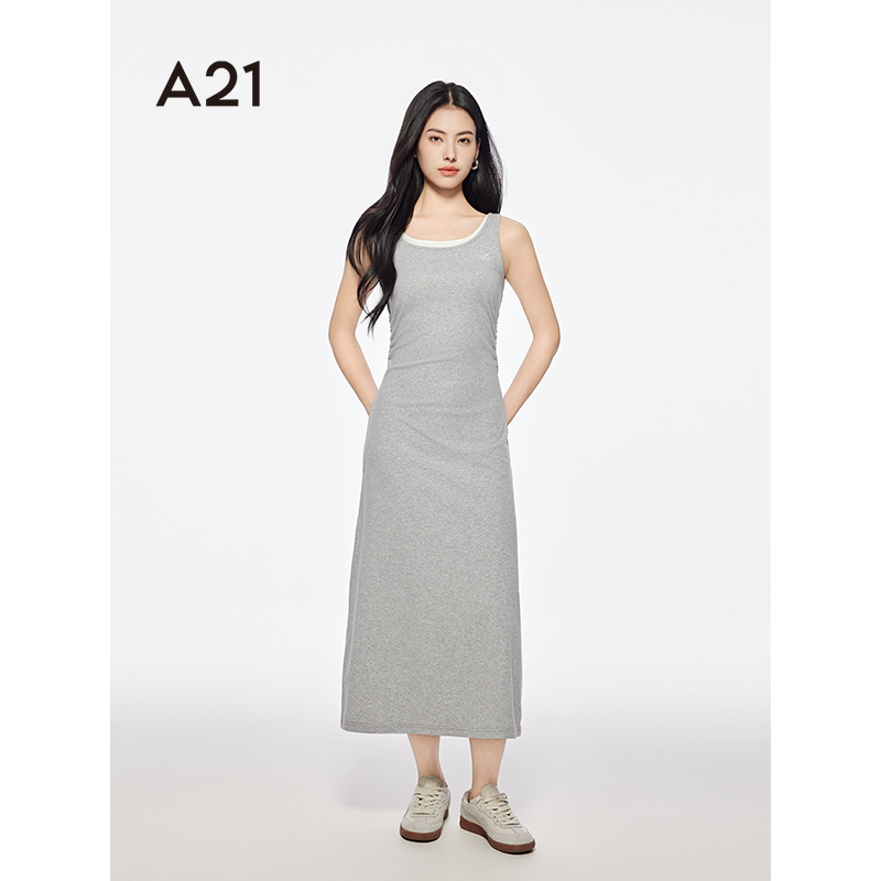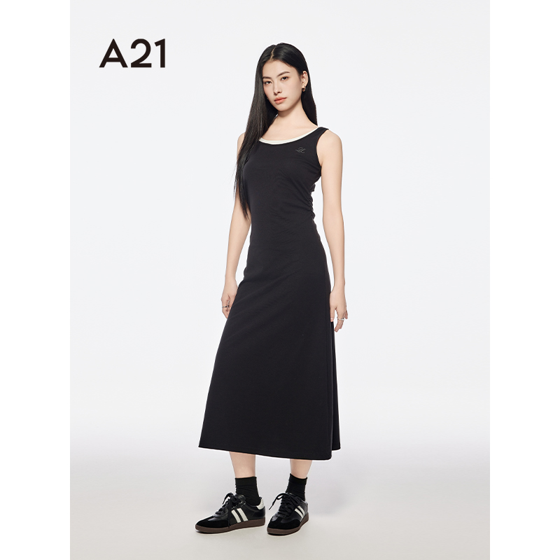 A21女装拼接大圆领假两件连衣裙2025夏季新款简约长裙修身背心裙