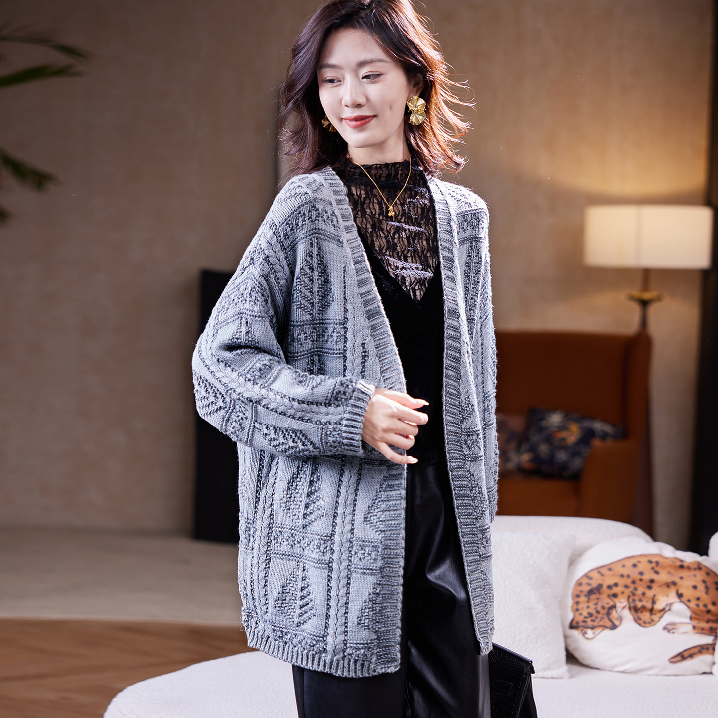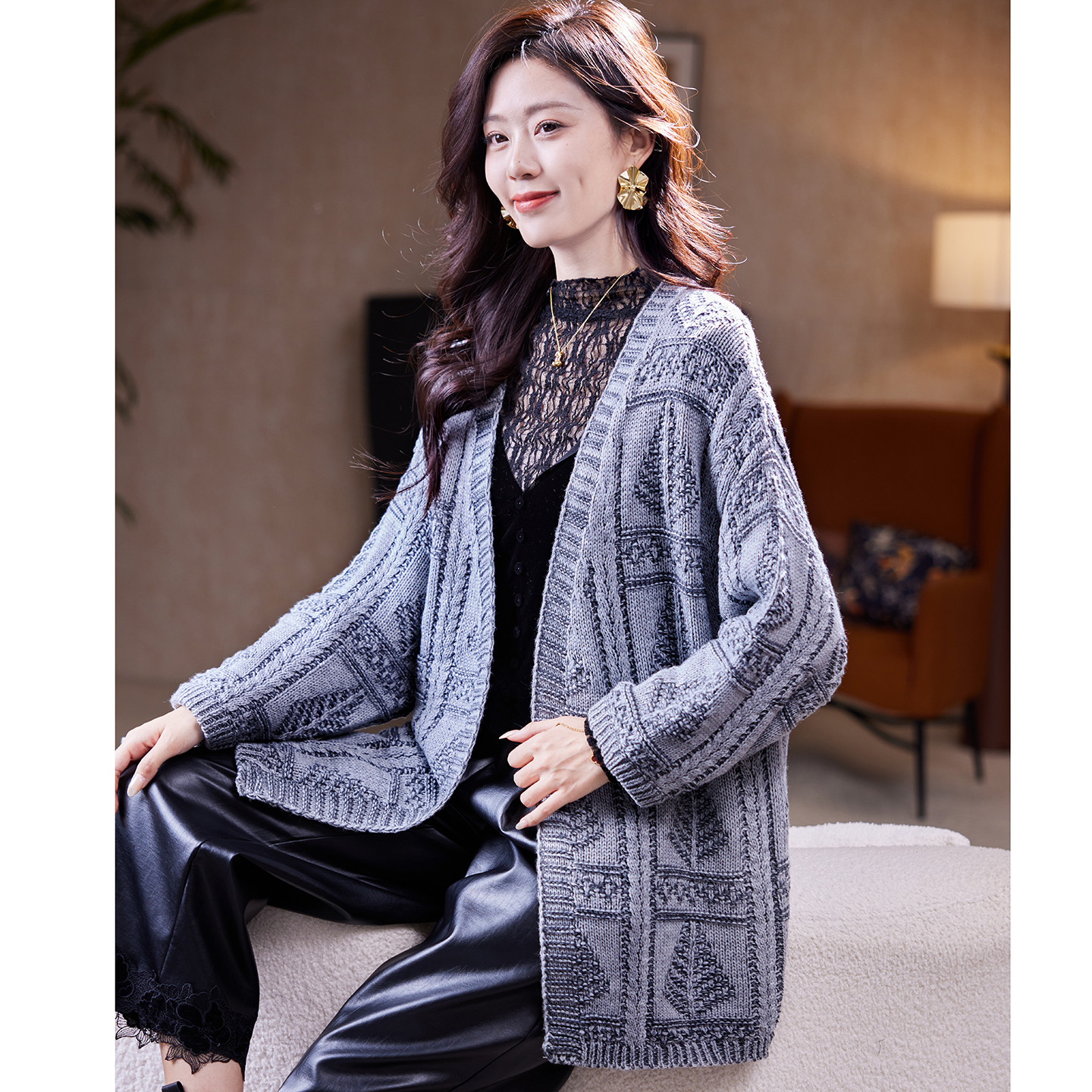 宝诗黎中长款慵懒针织外套女2025秋季简约宽松休闲百搭大码开衫