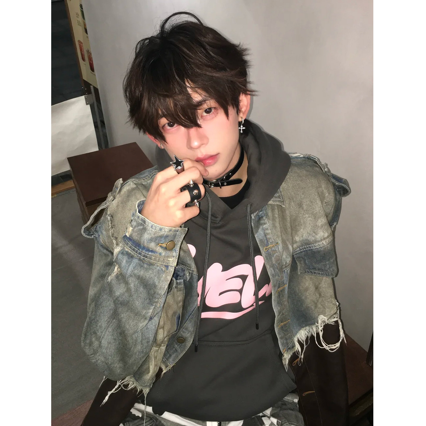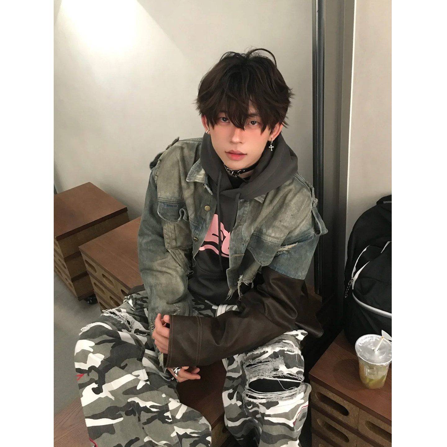 拼皮破坏毛边牛仔外套男美式复古做旧重工小众设计感脏脏皮衣夹克