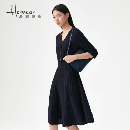 海尔曼斯V领连衣裙收腰显瘦针织裙通勤时尚百搭女长裙