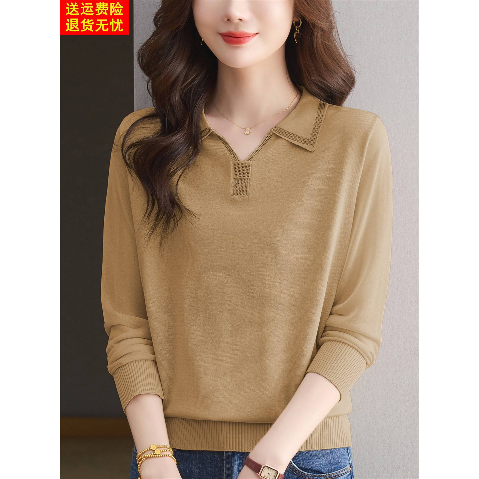 初秋桑蚕丝长袖t恤polo领网纱针织打底高端内搭洋气质小衫女上衣