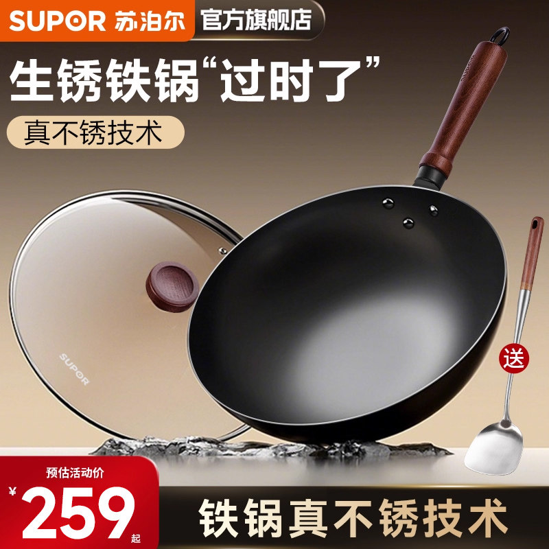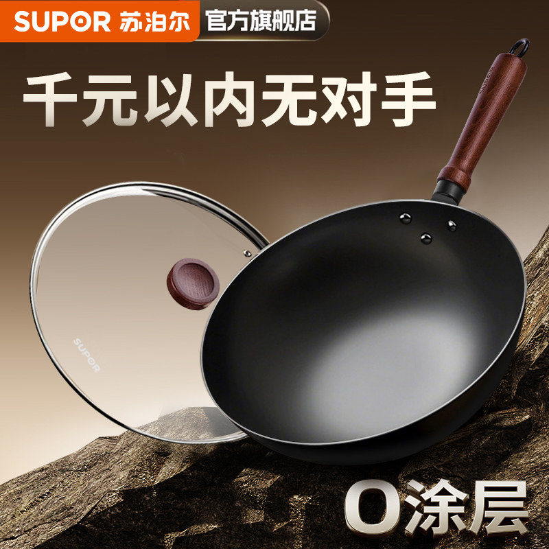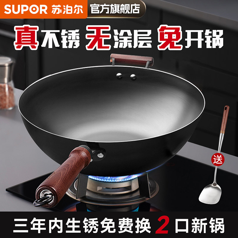 苏泊尔铁锅家用无涂层炒锅老式炒菜锅熟铁锅燃气煤气灶专用免开锅