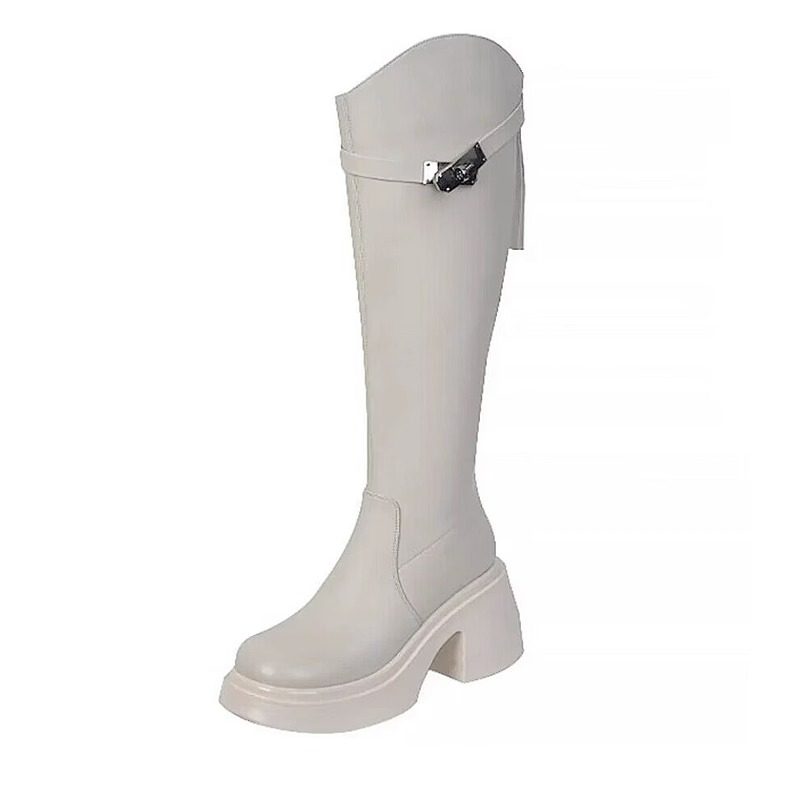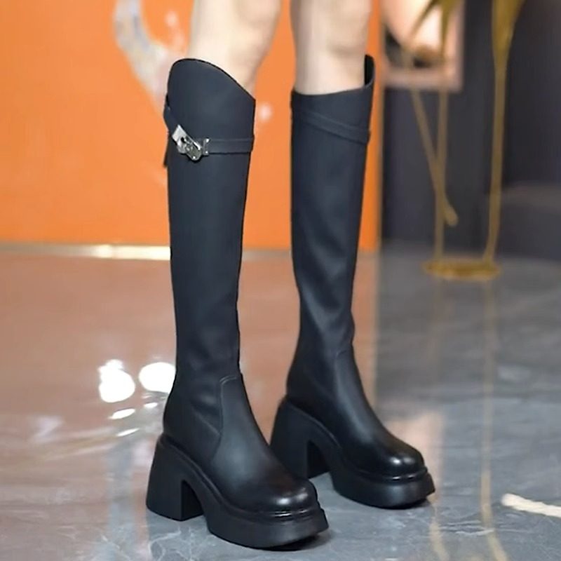欧美不过膝靴女厚底长靴2025秋冬新款皮带扣粗跟显瘦高跟骑士靴子