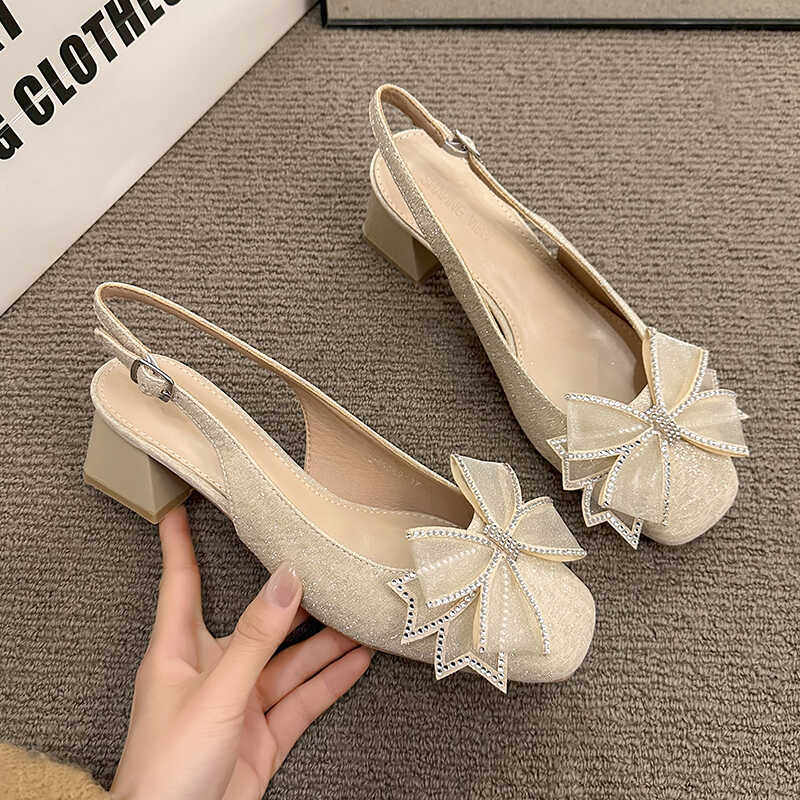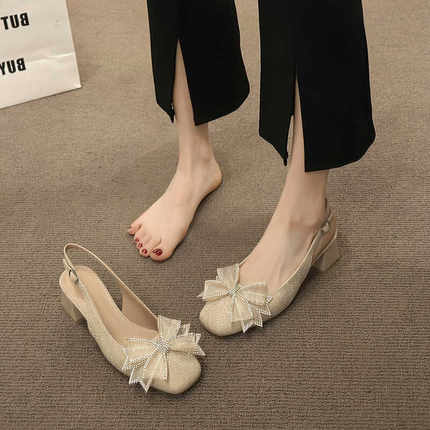 温柔法式蝴蝶结粗跟包头凉鞋