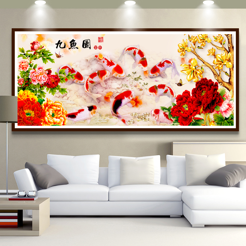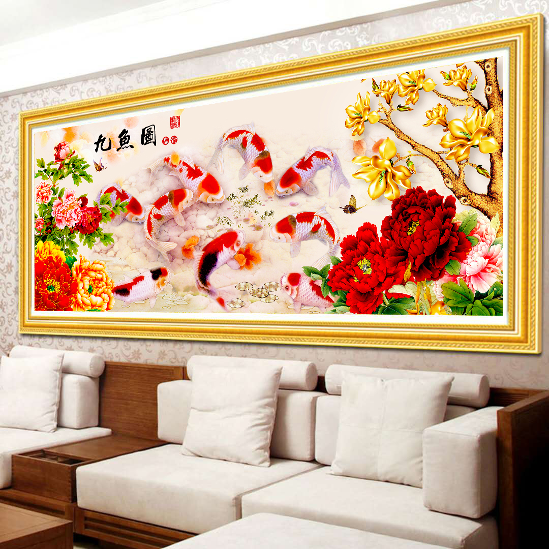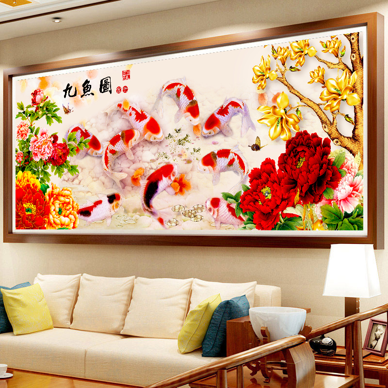 5D钻石画富贵牡丹九鱼图十字绣钻石客厅满钻点钻贴钻钻石绣砖石秀