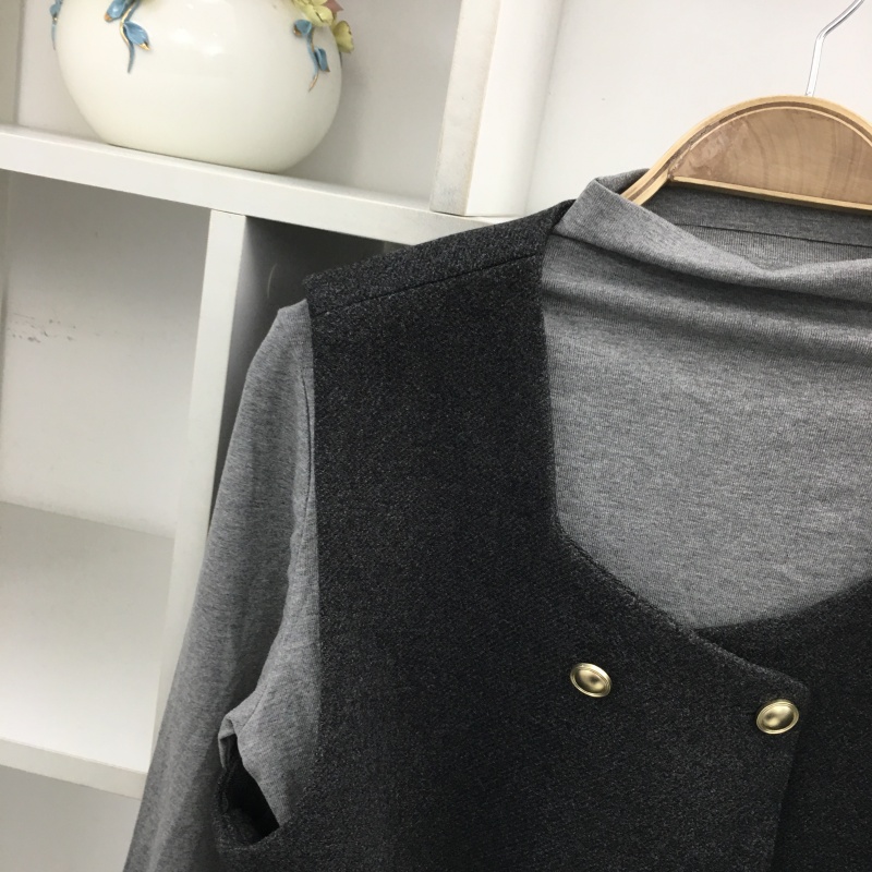 三件套排扣无袖深灰色毛呢背心马夹外套+打底+毛呢中长半身裙套装