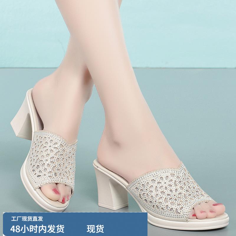 拖鞋女夏外穿时尚2025年新款水钻一字拖粗跟大码凉拖妈妈鞋高跟鞋