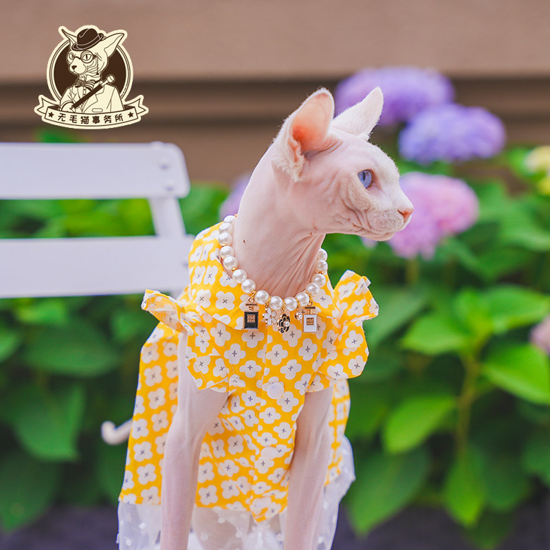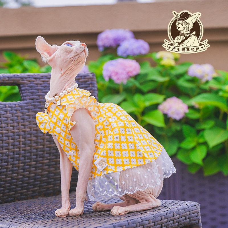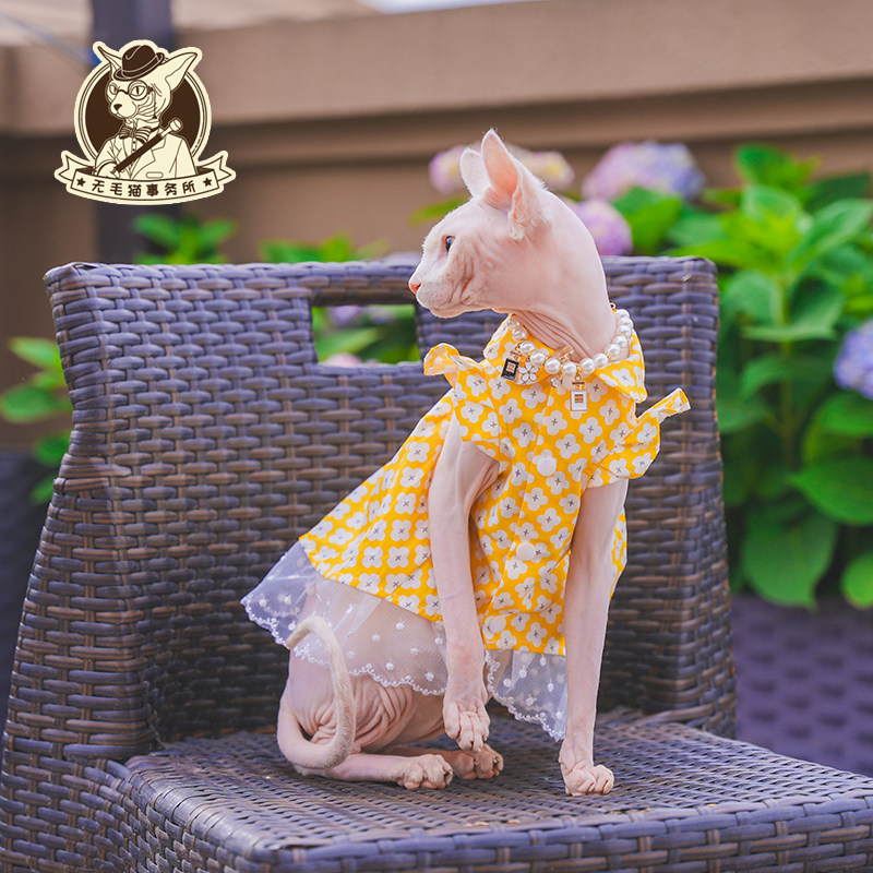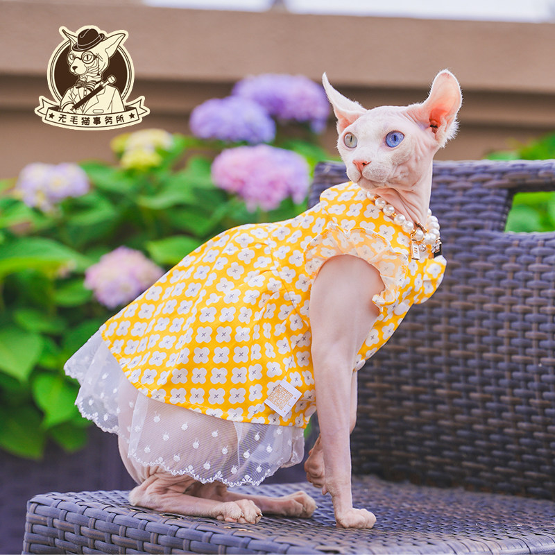 2023年夏季无毛猫斯芬克斯德文宠物猫咪纯棉布透气舒适蕾丝连衣裙