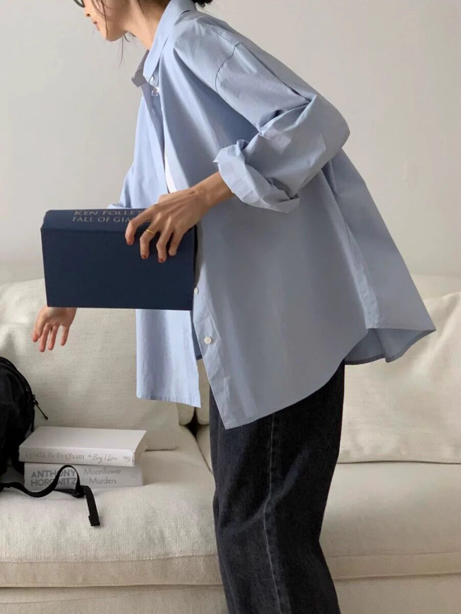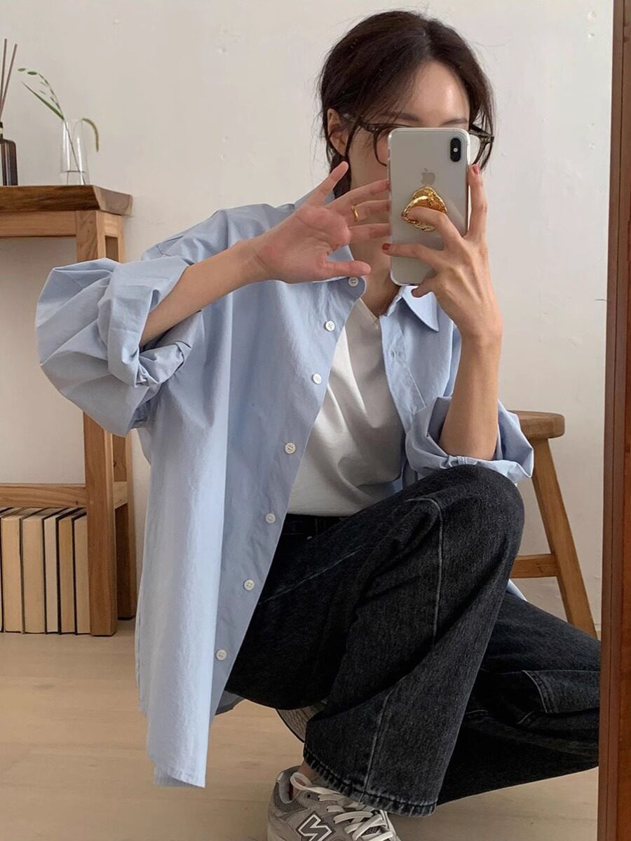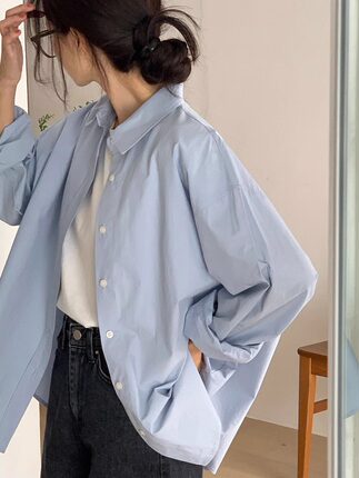 休闲ins韩系显瘦纯棉蓝色衬衫外套早春百搭款宽松长袖气质上衣女
