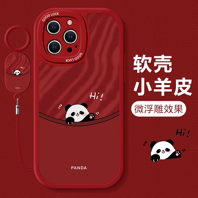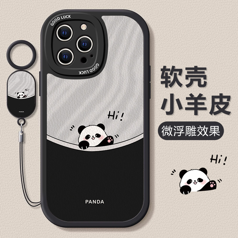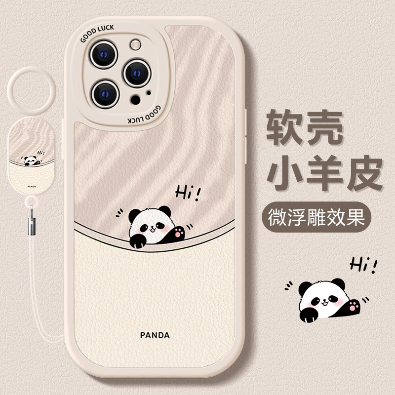 适用苹果15pro手机壳新款14可爱卡通招手熊猫iphone13软壳12promax带挂绳11高级感xs不会8plus撞壳7保护套6女