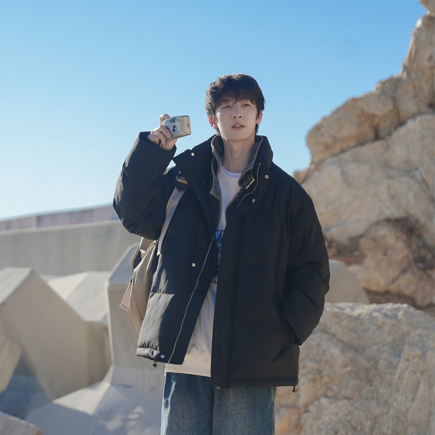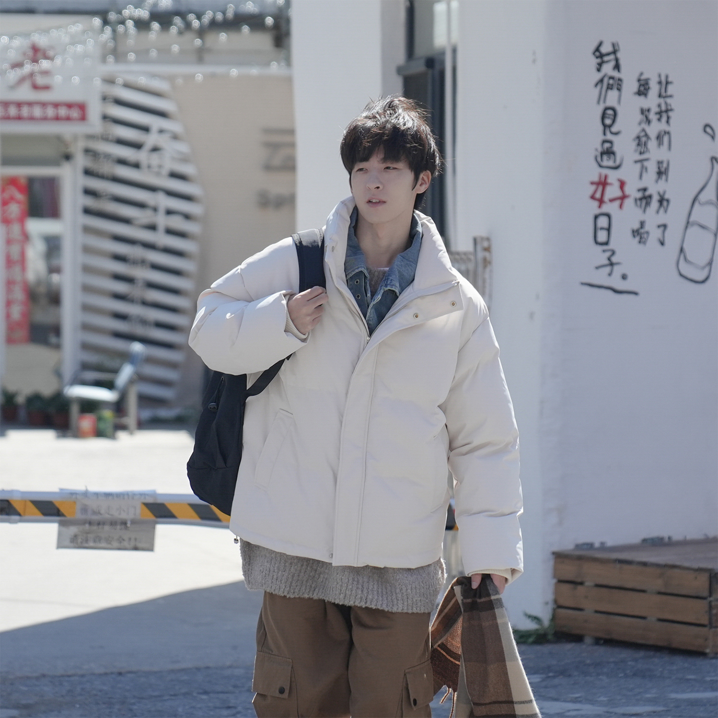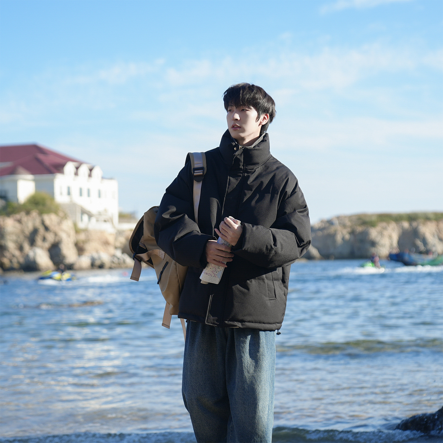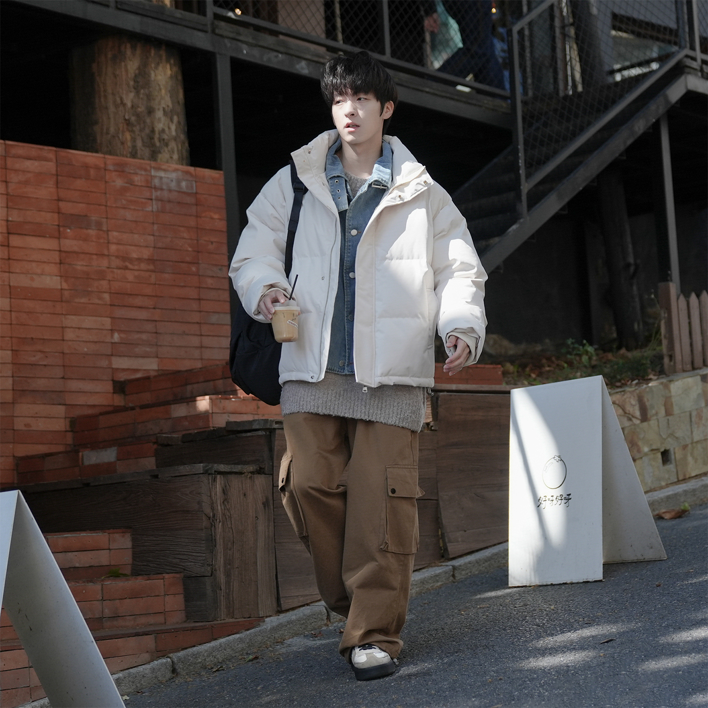 @港仔文艺男 假两件立领棉服男冬季加厚外套美式拼接牛仔面包服