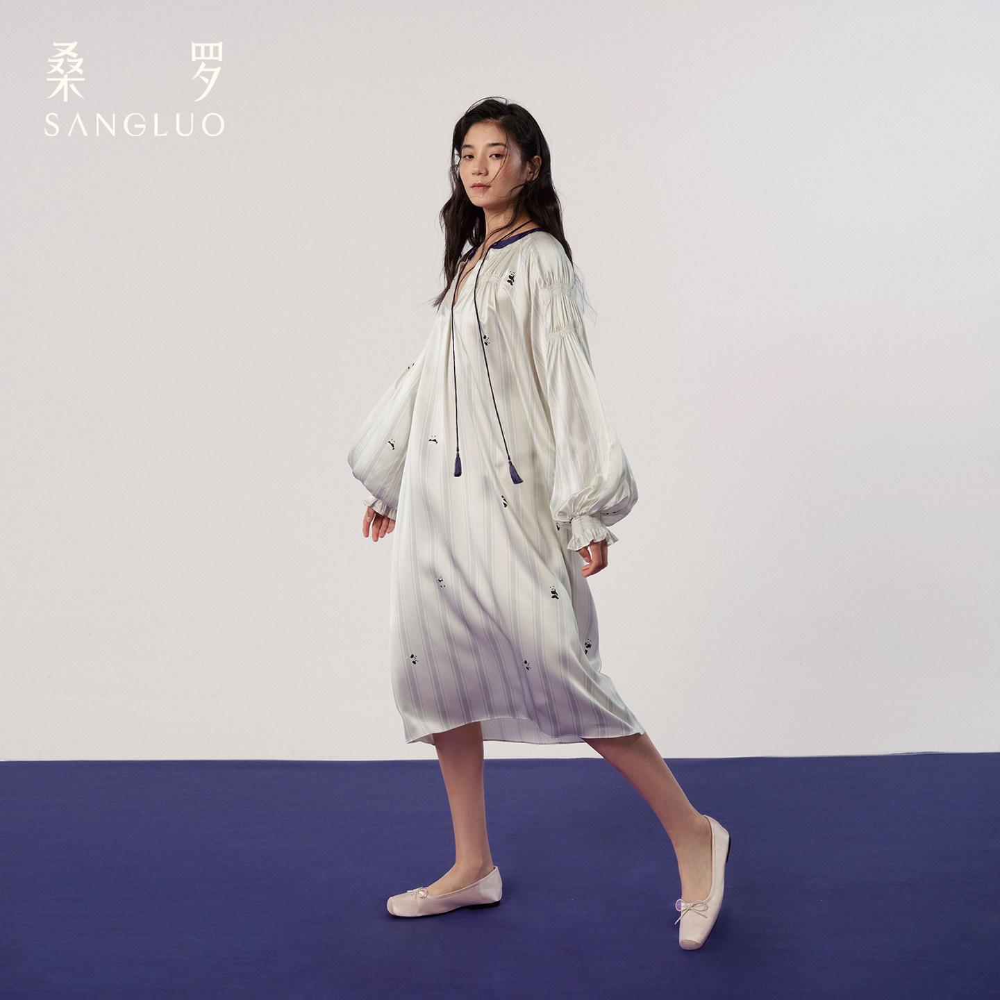 李兰迪同款』桑罗真丝熊猫连衣裙长袖睡裙条纹印花睡衣女家居服