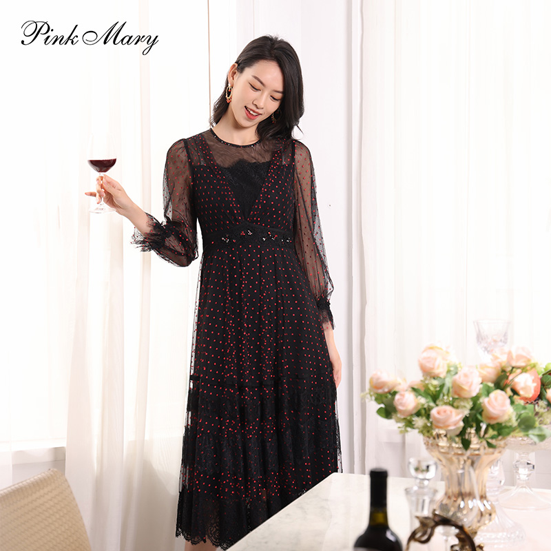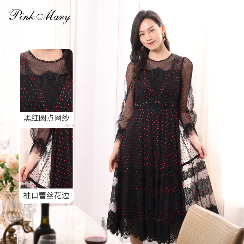 Pink Mary/粉红玛琍连衣裙女春秋时尚收腰网纱长裙PMAMS5523
