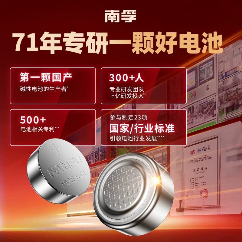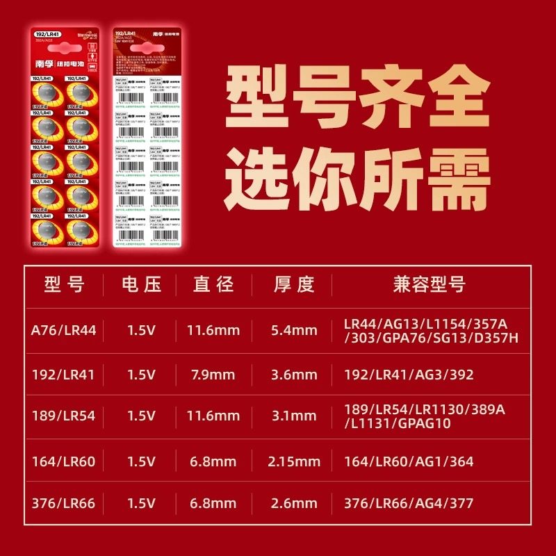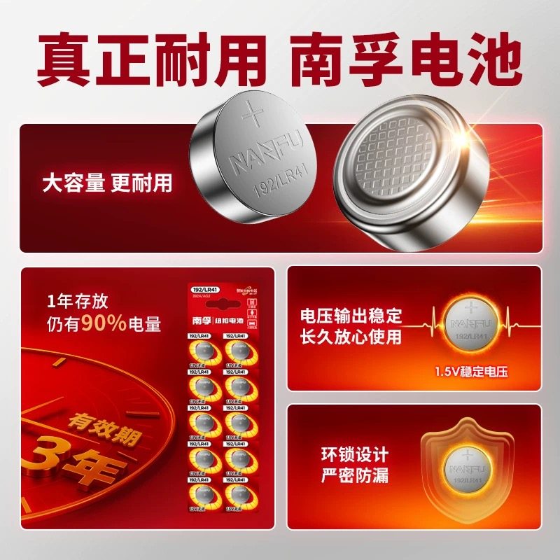 南孚LR41纽扣电池AG3温度计192 392A L736发光耳勺灯手表适用欧姆龙体温计1.5V电池10粒