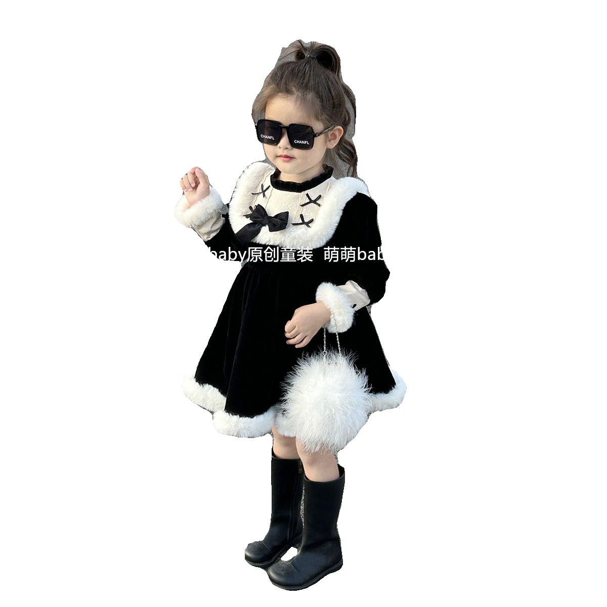 原创童装冬季女童甜美丝绒连衣裙2023新款儿童加绒气质长袖小黑裙